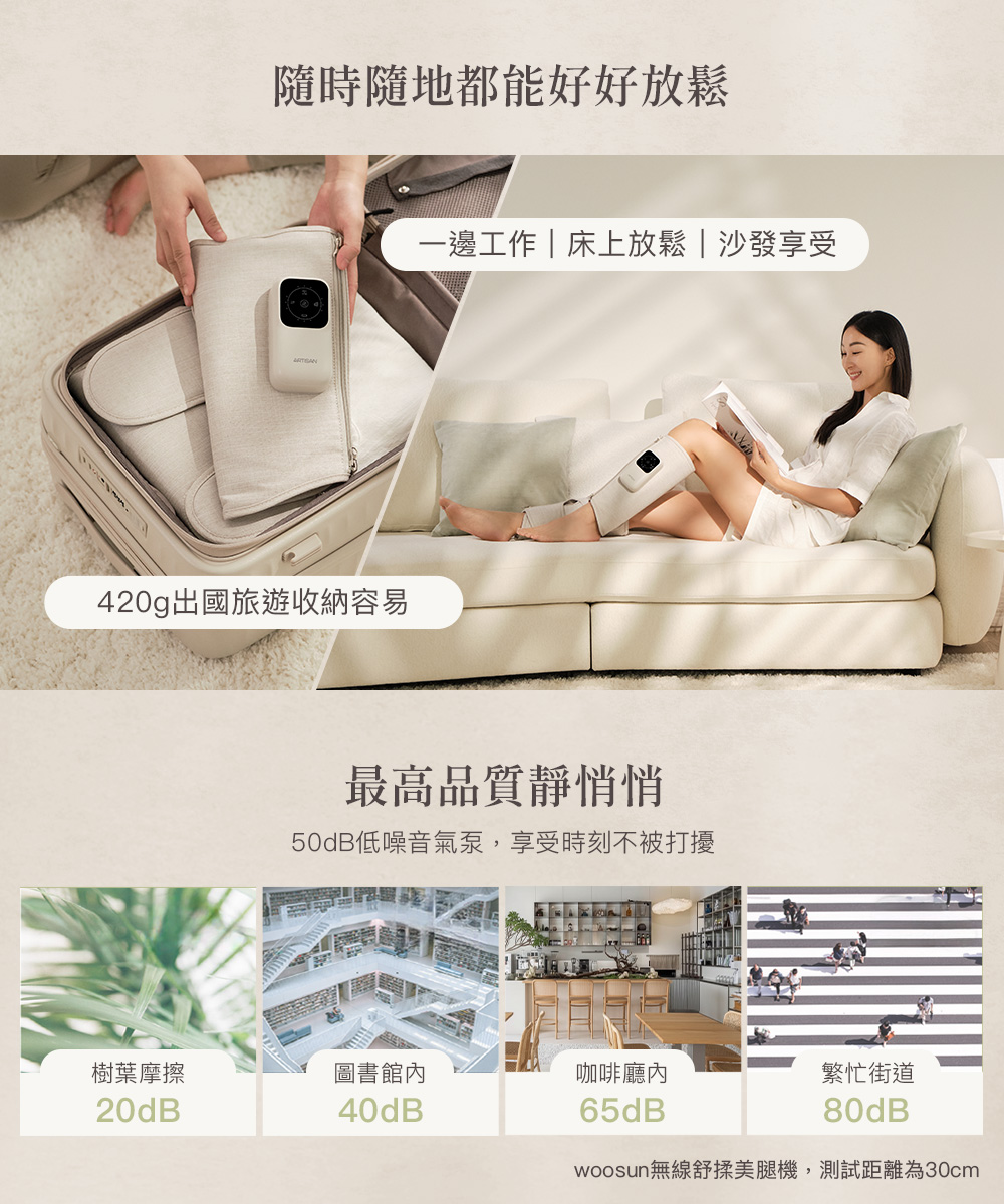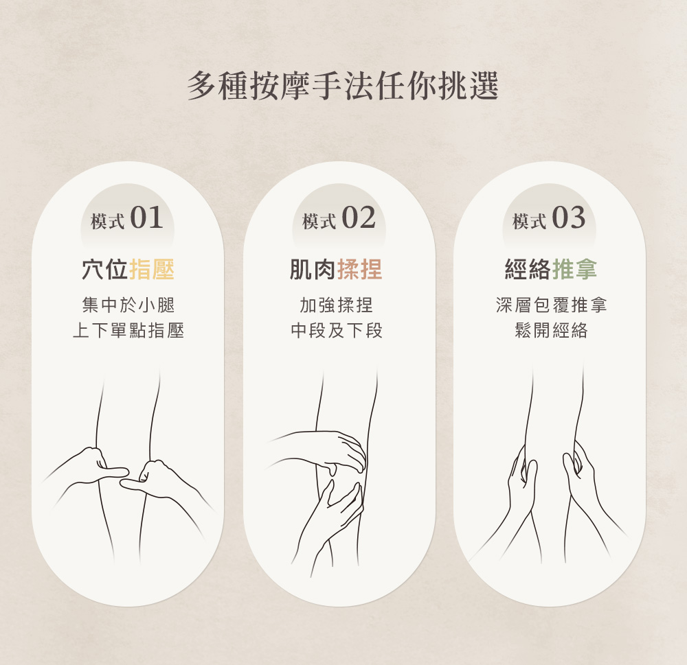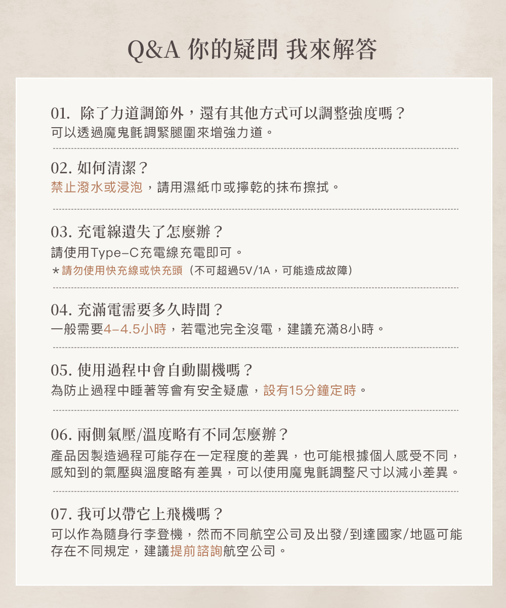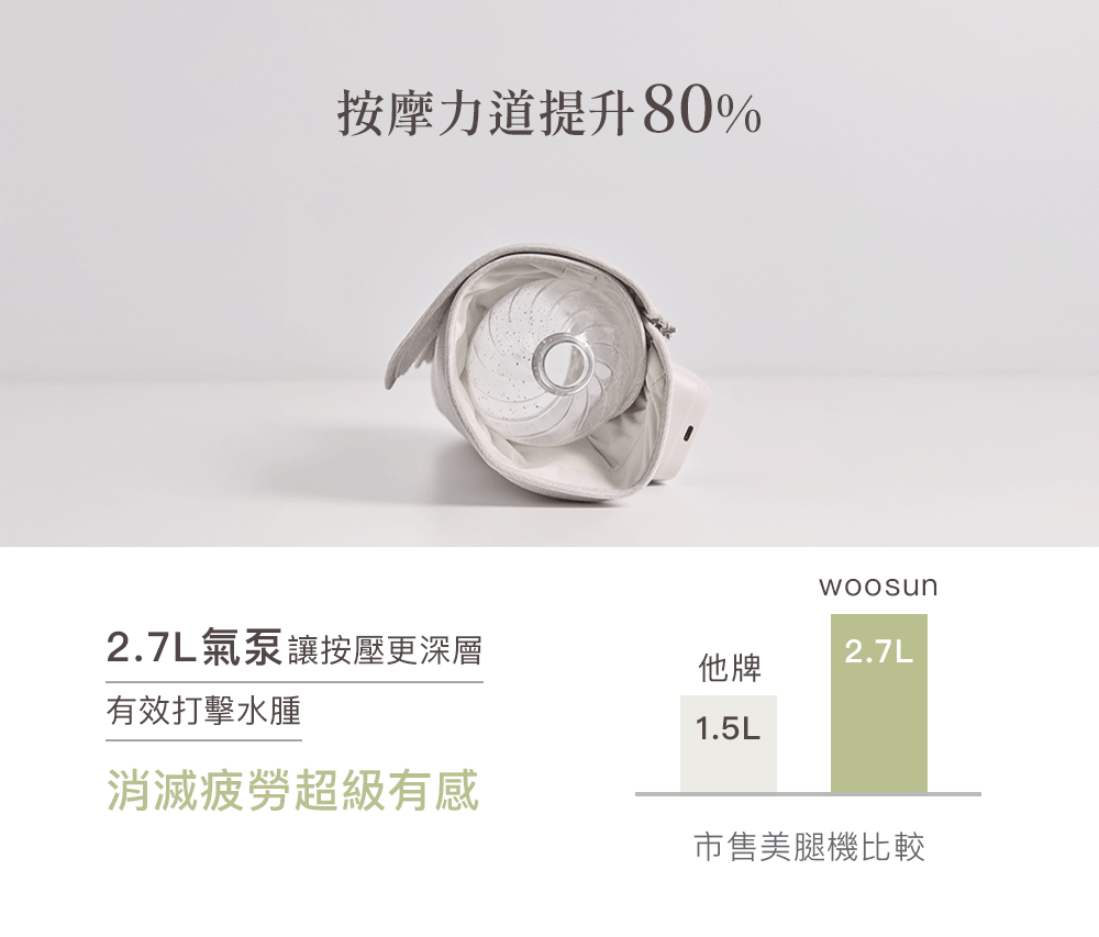 .一鍵操作,簡單便利.雙向拉鍊方便穿脫,記憶舒適尺寸.強力魔鬼氈調整,自由貼合.加寬加長設計,腿長腿圍舒適包覆.左右腿獨立氣囊,按壓更精準.3段力道 × 3種模式 × 3段加熱.2.7L強勁氣泵,深層舒緩水腫與疲勞.2500mAh電量/135分鐘續航,可使用9個循環.親膚透氣布料,易清潔耐用.50dB低噪氣泵.Y型充電線,雙腿同步充電.醫用級TPU氣囊:耐磨、耐高溫、高彈性.可摺疊收納,攜帶方便.電量顯示設計