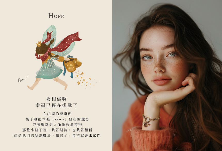然後,我們決定讓這個傳統,偷偷走進你的日常。今年冬天,「夢想木鞋仙子」已經悄悄啟程,她會提著一雙幸福小鞋,偷偷把你的願望收集起來,藏進一條手環裡,再裝作若無其事地遞給你。