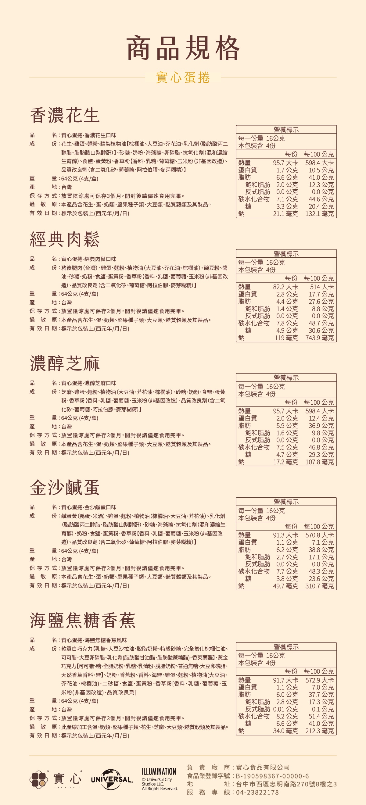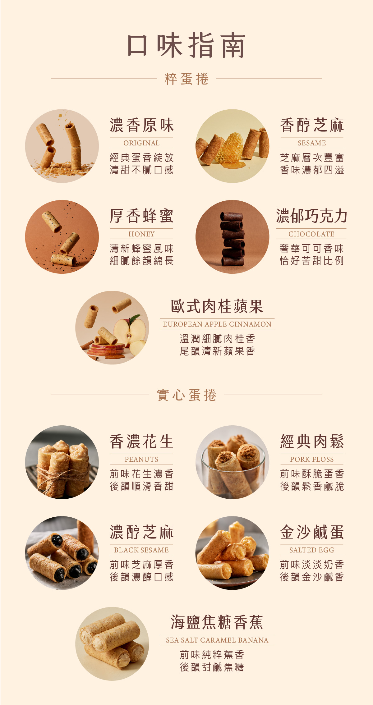 ・規格:32入粹蛋捲(濃香原味/香醇芝麻/濃郁巧克力/厚香蜂蜜/歐式肉桂蘋果,擇一)+4入實心蛋捲(香濃花生/經典肉鬆/濃醇芝麻/金沙鹹蛋/海鹽焦糖香蕉,擇一)+聯名提袋-小(隨機)+聯名貼紙