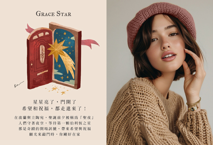 Grace Star,是黑夜裡第一道亮光,悄悄帶著希望與祝福,飛過夜空,來到你窗邊。願希望來敲門的時候,你剛好在家!