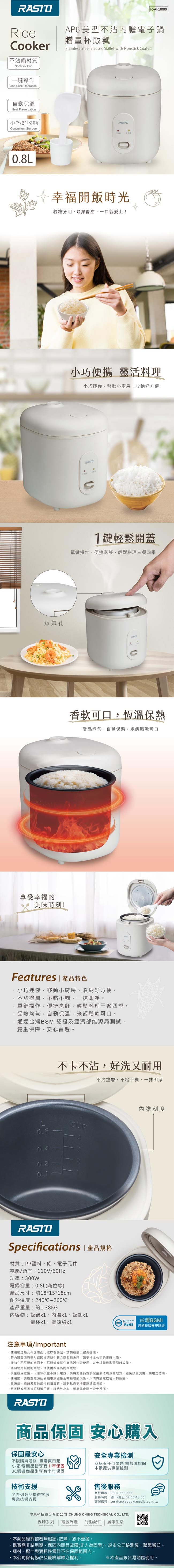 .BSMI識別碼:R53771,檢磁型號:R-ARB006.0.8L容量,輕巧不佔空間,適合1~2人份.一鍵操作,簡易按鍵設計,輕鬆烹煮.採用不沾塗層設計,方便清洗且更耐用.加熱均勻,鎖住米飯香氣與口感.可煮飯、粥、湯、蒸食等,一鍋多用.一鍵輕鬆開蓋設計,操作方便,不燙手.宿舍、辦公室、小家庭必備!輕鬆煮出香Q白飯