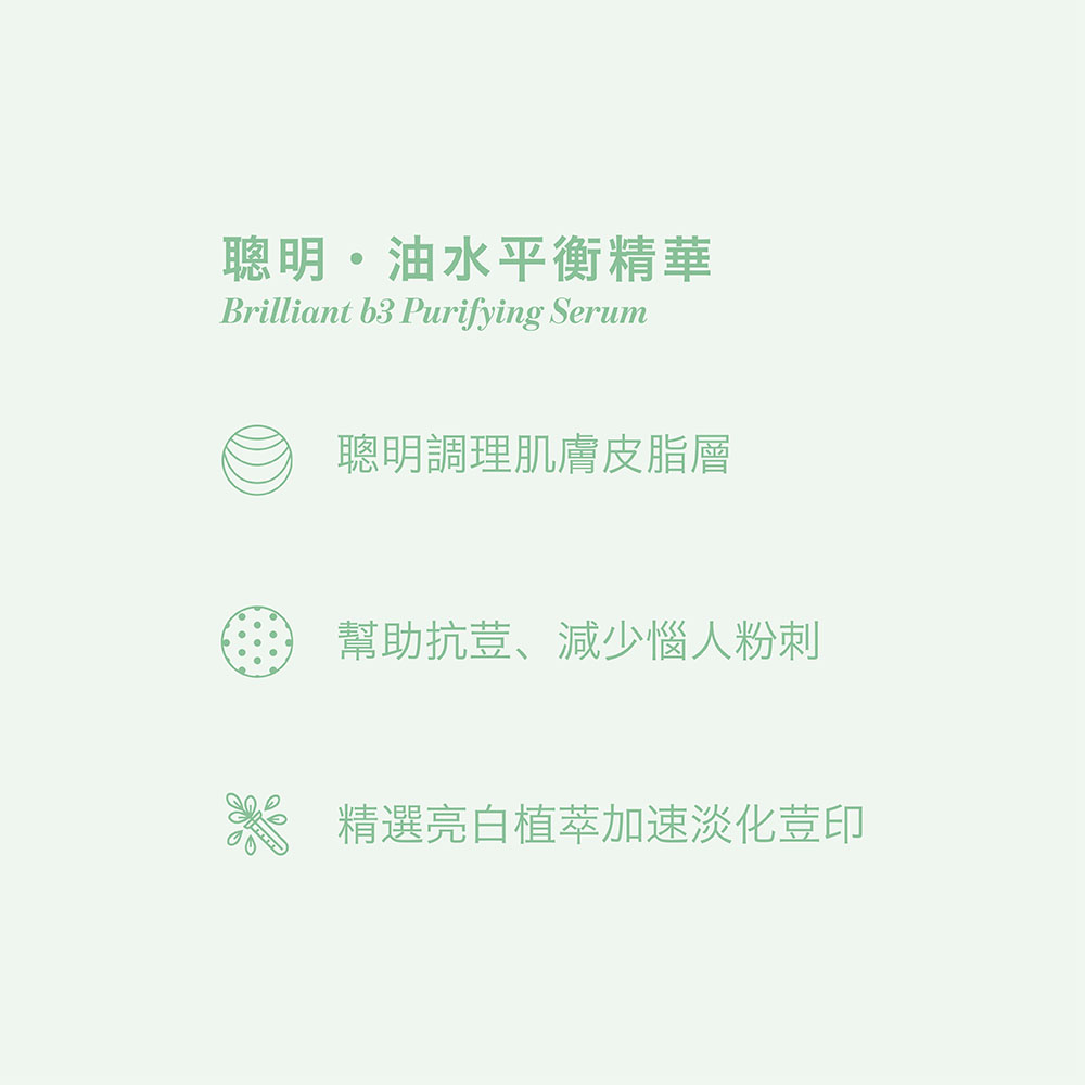 污染嚴重的外在環境再加上高壓的生活結構,油光滿面的肌膚是種沉默的抵抗。接踵而來的暗沉、油荳與阻塞等惱人的肌膚瑕疵,無非加劇你我對美的焦慮。聰明.油水平衡精華,從根本問題調理肌膚,補水調油,內外兼修;透過多樣的高山植物萃取,強化肌膚的適應力。即使外在依舊險峻,肌膚依舊盈刃有餘。