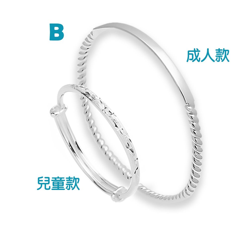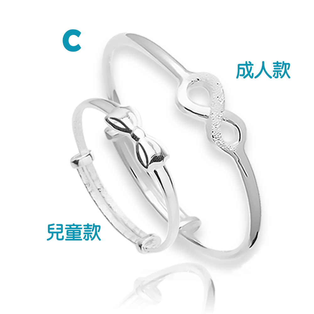 名稱:親子款純銀手鐲手環 8選1 YOU&ME (彌月銀飾 滿月禮 足銀)材質:純銀尺寸:適合0-10歲(內圍45-60mm可調整大小)(990千足銀手鐲屬手工製作,重量上會略有正負落差,敬請見諒!)配件:包裝盒x1、保證卡x1、手提袋x1