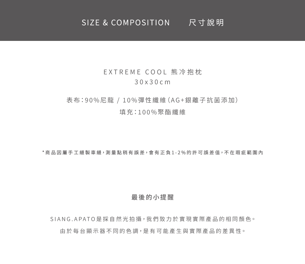 ※此品項為隨機出貨不挑款,下單前請注意「大人小孩都想咬一口的冰涼麻糬。」◆業界頂標 Qmax涼感值 0.535◆表布: 90% Nylon + 10% Spandex(Ag+銀離子抗菌添加)◆填充: 100% Polyester◆ 尺寸30 x 30cm