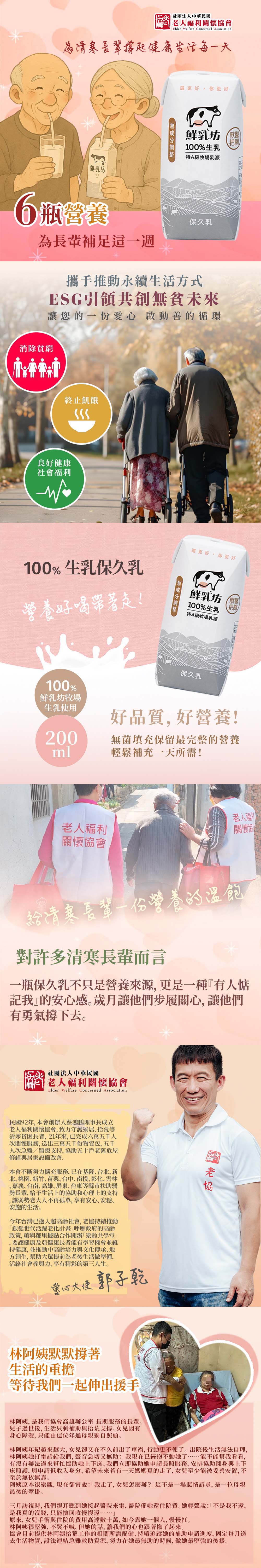 品名:【老人福利關懷協會x鮮乳坊】長輩的營養6日守護公益募集(原味保久乳*6瓶)(購買者本人不會收到商品)重量/容量: 200毫升*6瓶內容物: 原料 :100%生乳 (符合CNS 3055) 成分:乳脂肪3.0%以上(無調整),非脂肪固形物8.25%以上