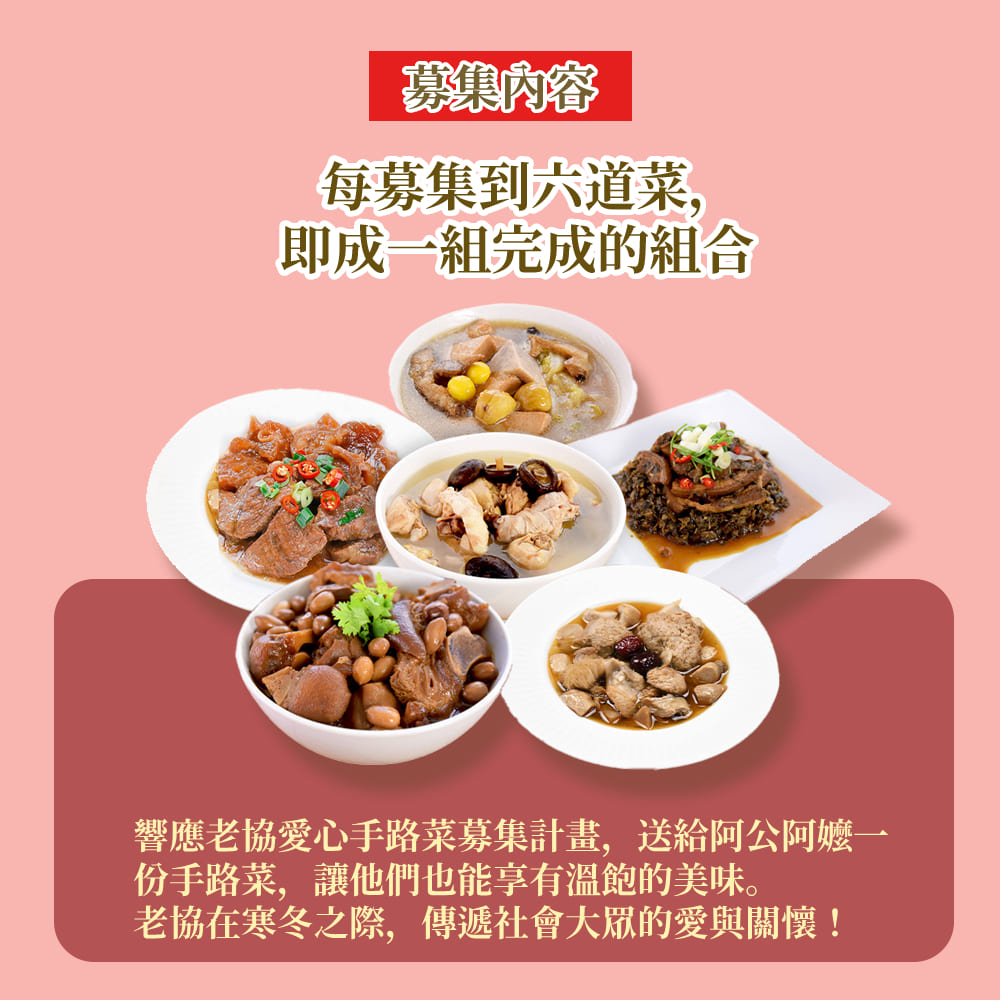 商品介紹*每集結6道菜*就是一套完整組合送到老人福利關懷協會*老協在寒冬之際,傳遞社會大眾的愛與關懷*購買者不會收到商品*勸募字號:衛部救字第1141360431號