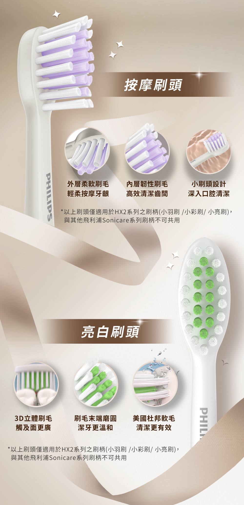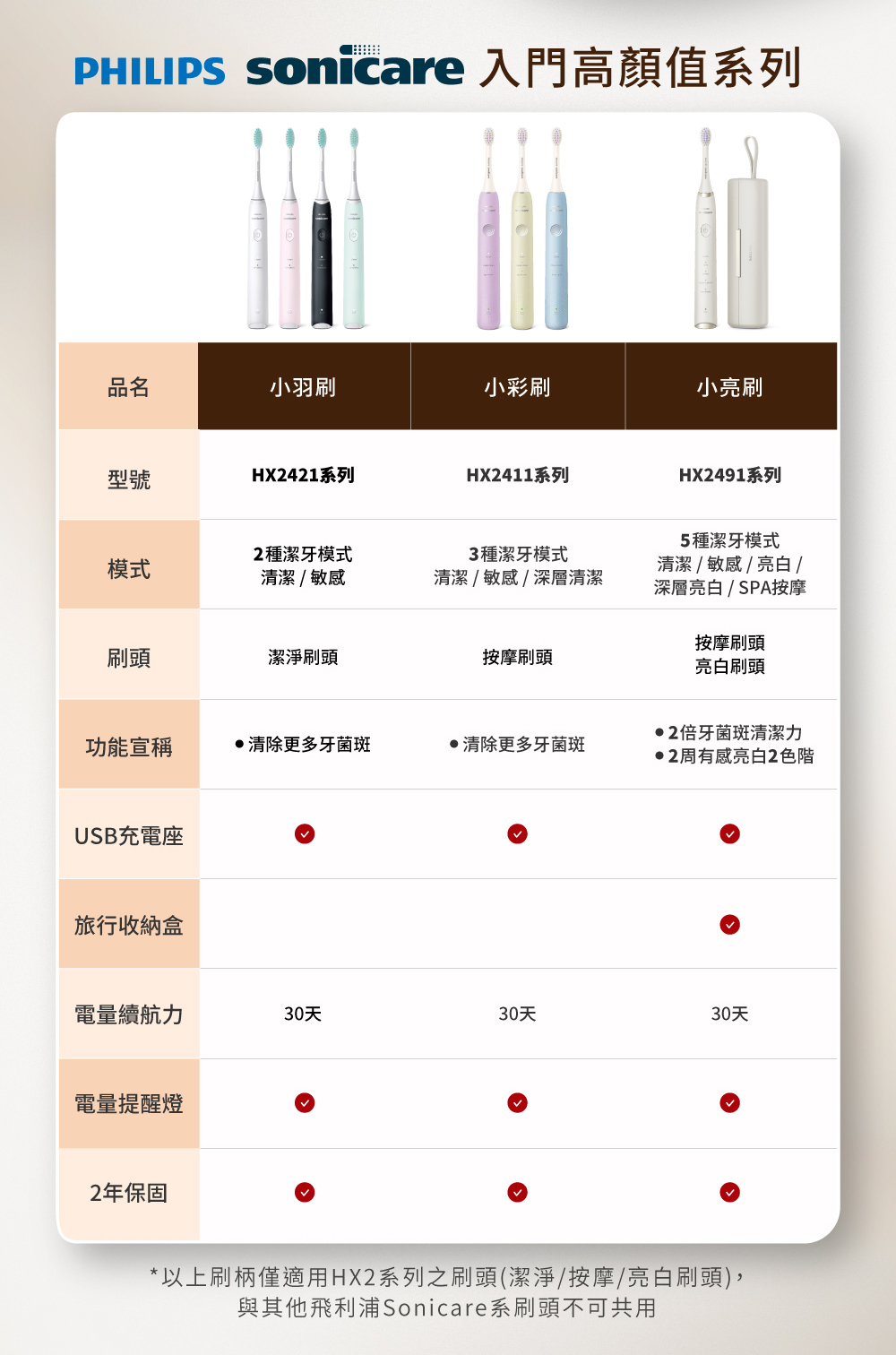 商品特色2款刷頭雙重享受:輕柔亮白,專業按摩刷毛更軟、小刷頭設計,更易深入後側牙齒5種潔牙模式全新升級2倍牙菌斑清潔力,2週有感亮白2色階30天超强電量續航,打造深層清潔效果輕巧旅行收納盒,潔牙時刻優雅得體全機IPX級防水,防潮防發霉全球享兩年保固本系列電動牙刷需搭配HX2系列輕柔刷頭使用銷售重點新上市Sonicare輕柔多效音波電動牙刷,讓您的口腔護理更加完美。採用每分鐘3萬次高頻音波震動流體潔力,有效為你清潔牙齒表面和牙縫、深層去除牙菌斑,讓口氣更加清新,提升清潔效果設計更勝手動牙刷。現在下單再送限量好禮,享受質感生活同時展現自信迷人微笑!商品規格商品品牌:PHILIPS 飛利浦商品名稱:輕柔多效音波震動牙刷 電動牙刷-小亮刷珍珠白商品型號:HX2491/01商品顏色:白色商品產地:中國商品電壓:110-220V商品電池:充電式鋰電池商品配件:牙刷機身*1、柔軟刷頭*1、溫和亮白刷頭*1、充電座*1 (110-220V國際電壓) 、旅行收納盒*1商品保固:全球2年【BSMI商檢字號】:無需商檢 ★退 / 換貨注意:此為【個人衛生用品】,鑑賞期之內無法提供試用,一經拆封使用,將會影響退貨權限。依照消費者保護法規定,消費者均享有商品到貨七天鑑賞期之權益。但退回商品必須是全新狀態且完整包裝 (保持商品、附件、包裝、廠商紙箱及所有附隨文件或資料之完整性) 。商品文案、價格為原廠/廠商所提供,若有變動敬請參照實際商品及實際網路價。