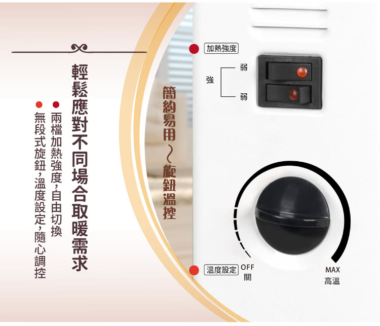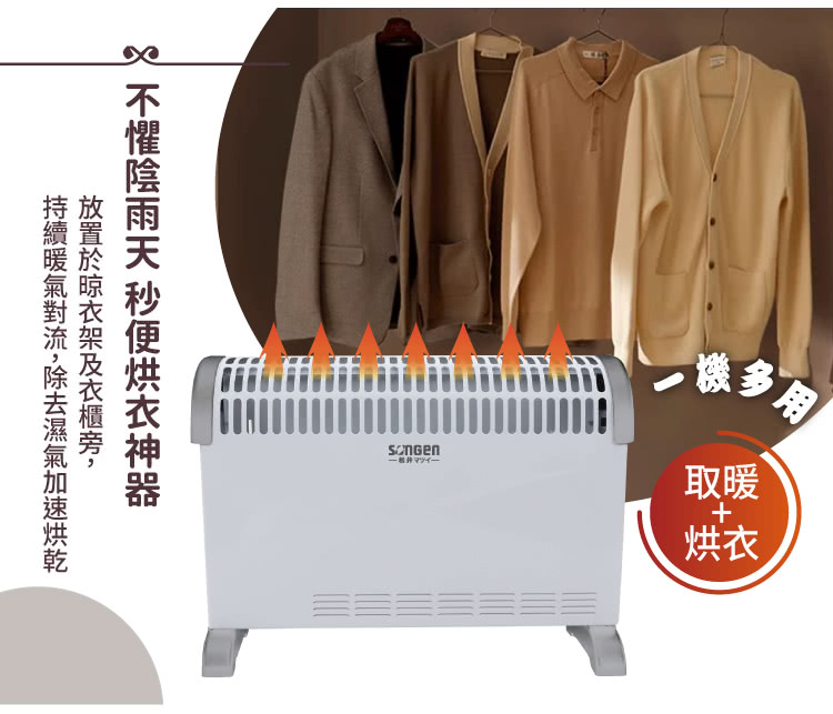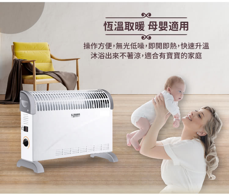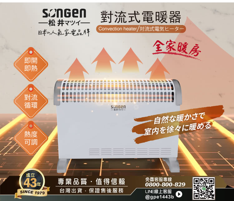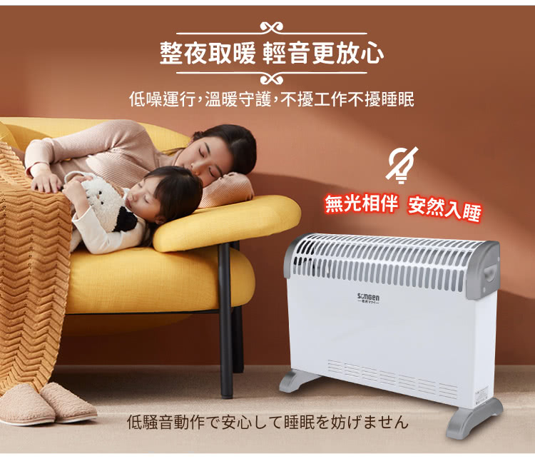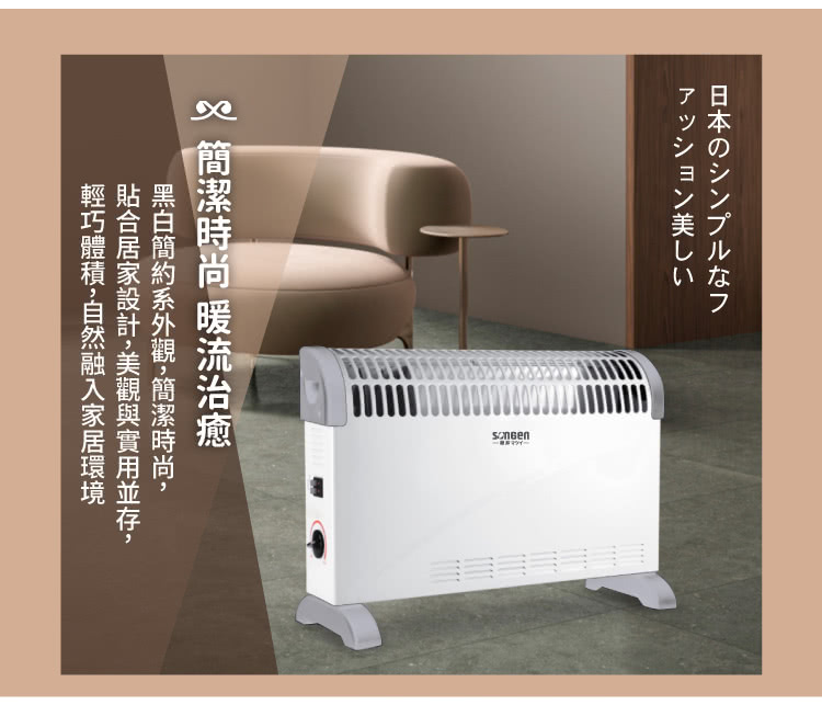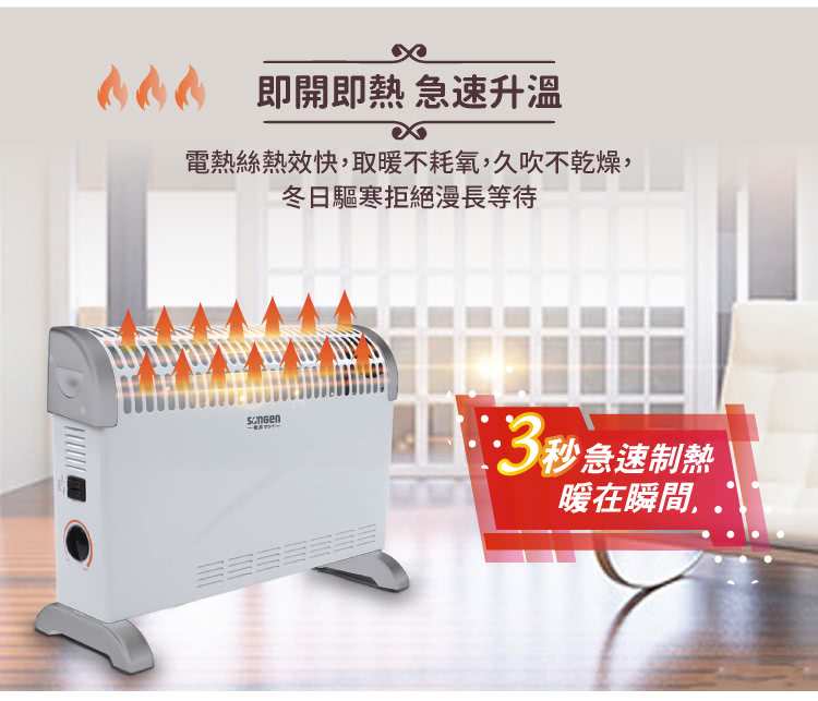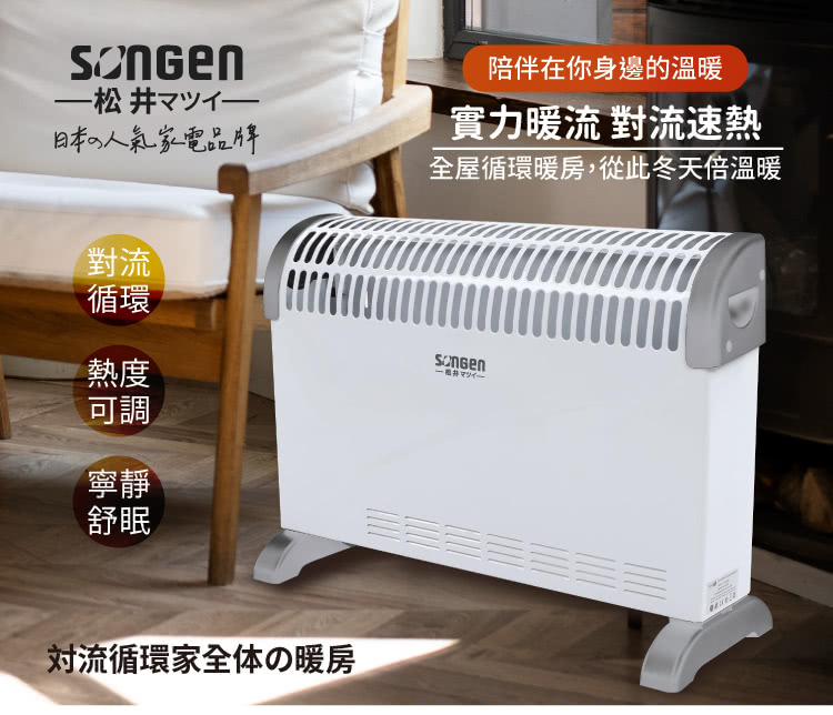 商品特色強弱兩檔加熱強度,方便易操作無段式旋鈕自由調節,恆溫控制過熱斷電保護,使用更安心商品規格商品品牌:SONGEN松井 商品型號:SG-160RCT 商品名稱:對流式溫控電暖器使用電源:110V / 60Hz額定功率:1400W產品尺寸:寬520x深107x高335mm商品重量:2.9KG產品保證:明台產物保險2000萬產品責任險商檢字號:R73998商品保固:一年保固