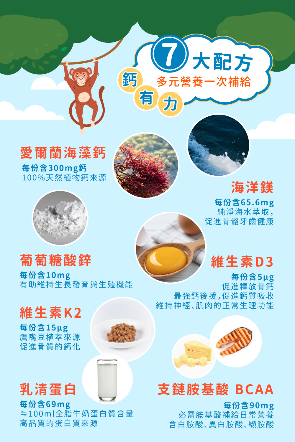 成分:紅藻粉(海藻鈣)、全脂奶粉、麥芽糊精、優格香料粉(氧化澱粉、香料、二氧化矽、乳酸)、海水抽出物[氧化鎂(海水來源)、羧甲基纖維素鈉]、支鏈胺基酸粉(L-白胺酸、L-異白胺酸、L-α胺基異戊酸、卵磷脂)、乳清蛋白、葡萄糖酸鋅、二氧化矽、檸檬酸、鷹嘴豆維生素K2粉、微結晶纖維素、中鏈三酸甘油酯、鷹嘴豆抽出物(含維生素K2)、蔗糖素(甜味劑)、維生素D3粉、辛烯基丁二酸鈉澱粉、蔗糖、維生素C(抗氧化劑)、中鏈三酸甘油酯、二氧化矽、維生素E(抗氧化劑)、維生素D3(奶素)食品添加物:氧化澱粉、二氧化矽、乳酸、氧化鎂、羧甲基纖維素鈉、L-白胺酸、L-異白胺酸、L-α胺基異戊酸、葡萄糖酸鋅、檸檬酸、蔗糖素、辛烯基丁二酸鈉澱粉、維生素C、維生素E、維生素D3