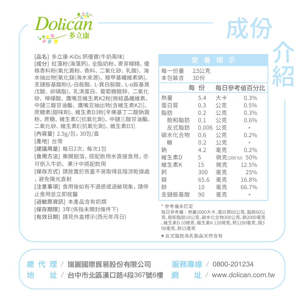 商品內容 名稱:多立康-KiDs鈣優寶(牛奶風味)-30包/盒