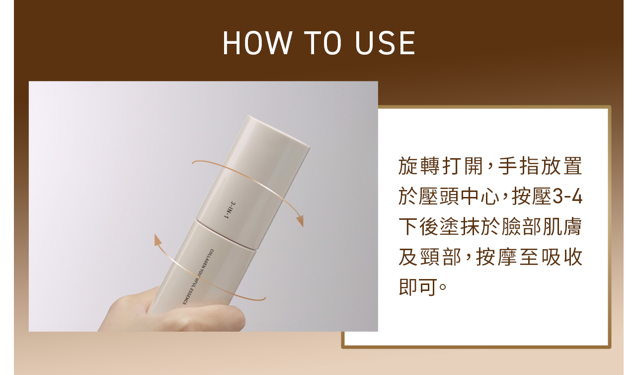 旋轉打開,按壓2-3下後塗抹於臉部肌膚及頸部,按摩至吸收即可。