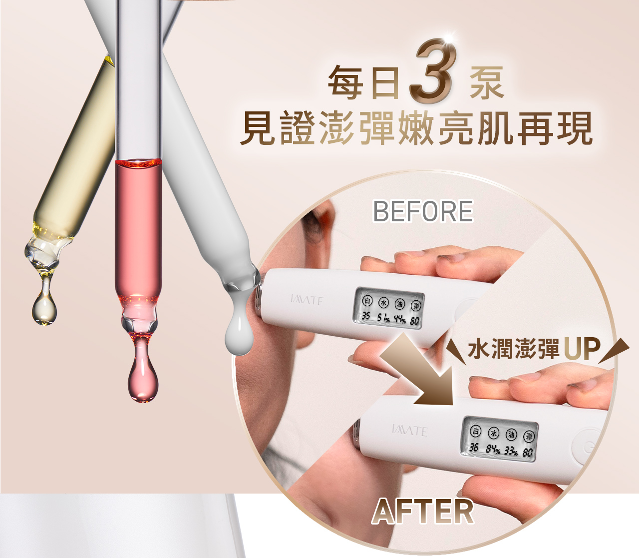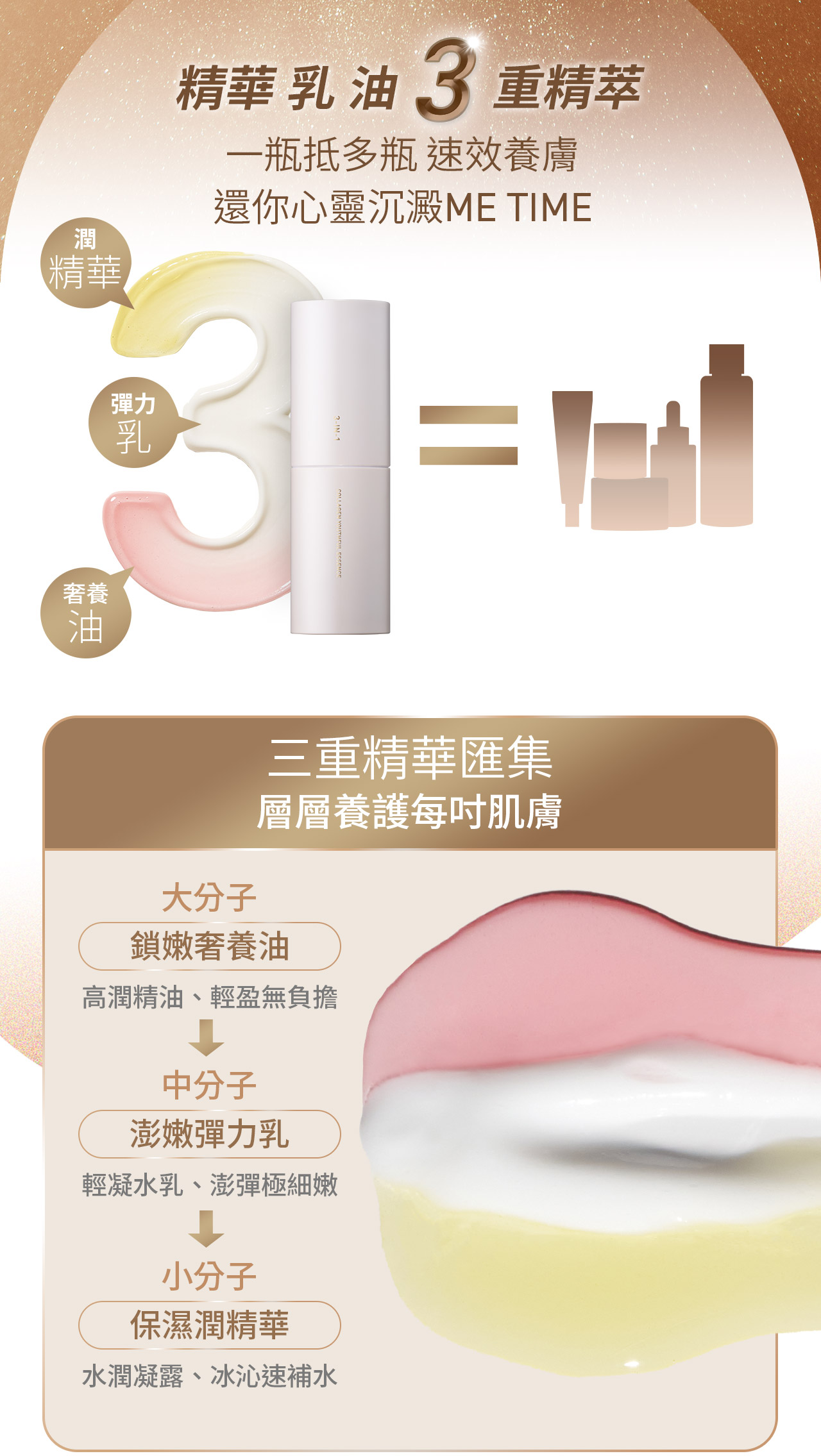 精華、乳、油完美三重精萃比例,速效保養不費時。