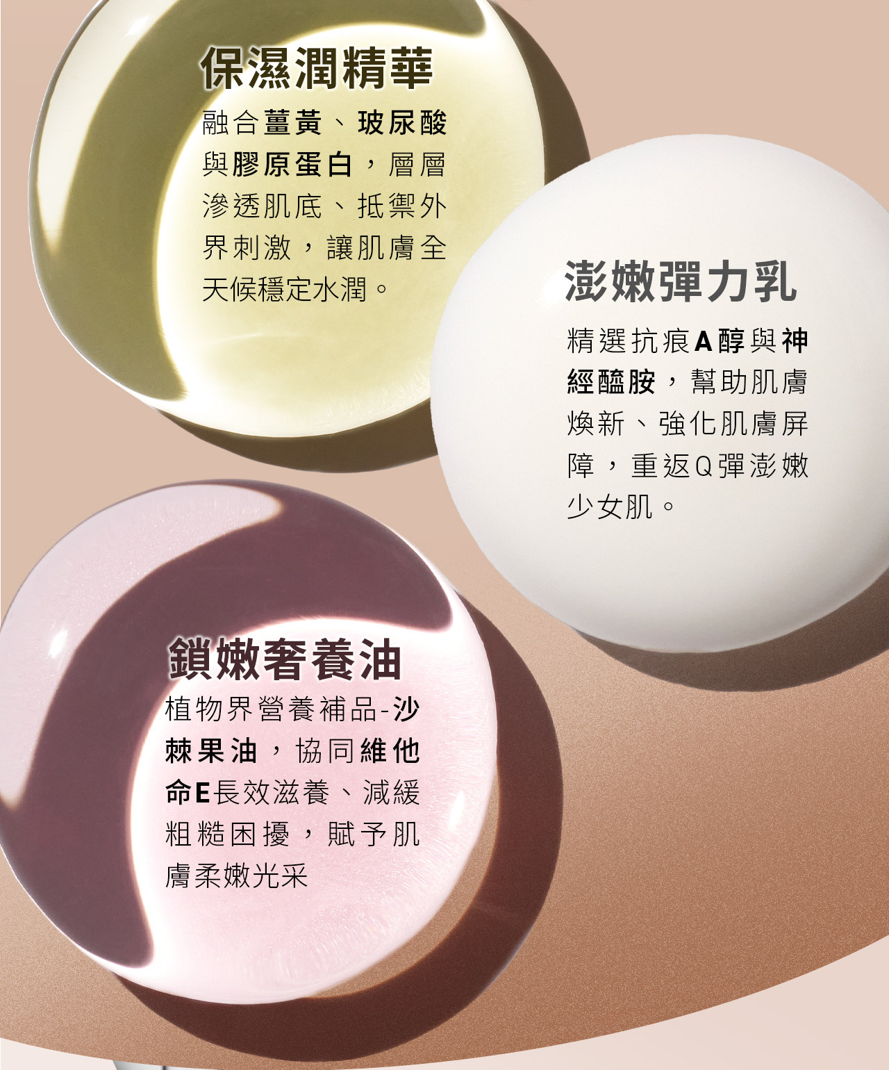 膠原蛋白、A醇與玻尿酸添加,屏障煥新,養出澎彈膠原肌。