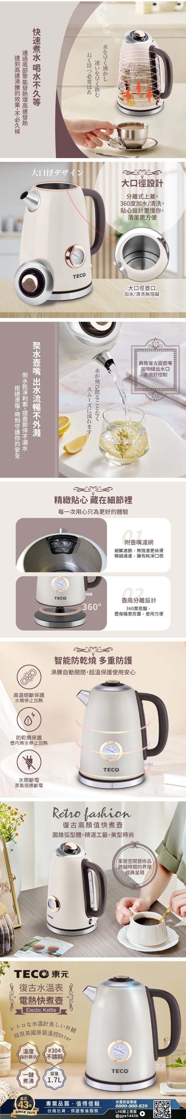 商品特色復古精美錶盤式水溫表 304#不鏽鋼材質,堅實耐用 水位視窗,水量看得見 採用英國otter溫控,耐用安全 壺底分離設計,無線式壺體 沸騰、乾燒自動斷電保護功能商品規格 商品品牌:TECO 東元 商品名稱:英國otter溫控復古1.7L水溫表電熱快煮壺商品型號:XYFYK1703W 淨米白/XYFYK1703G 太空灰 商品尺寸:224x161x239mm 商品重量:0.92kg 商品容量:1.7公升 額定電壓:AC110V/60Hz 額定功率:900W 產品保證:明台產物保險2000萬產品責任險BSMI:R73998