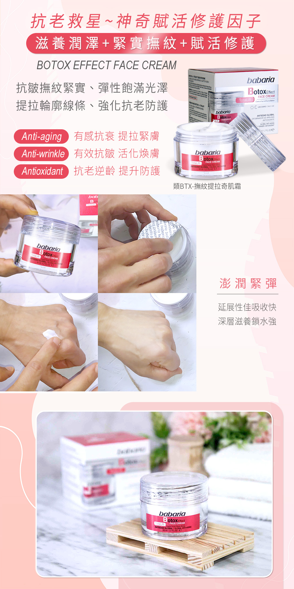 抗皺撫紋緊實、彈性飽滿光澤