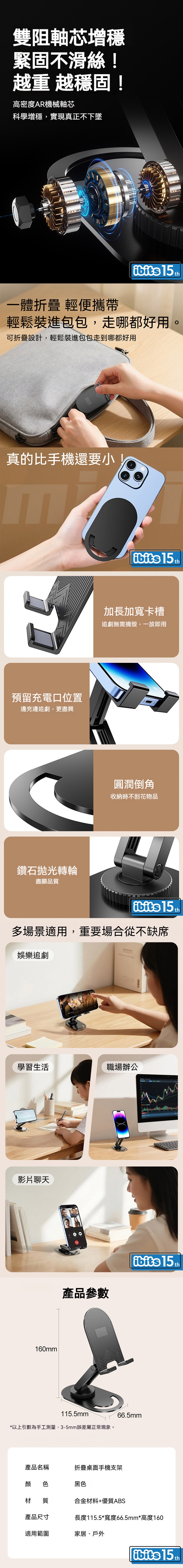 一體折疊 輕便攜帶 輕鬆裝進包包 走哪都好用。可折疊設計,輕鬆裝進包包走到哪都好用-----------------------------------------產品參數產品名稱:折疊桌面手機支架顏色:黑色材質:合金材料+優質ABS產品尺寸:長度115.5*寬度66.5mm*高度160適用範圍:家居、戶外