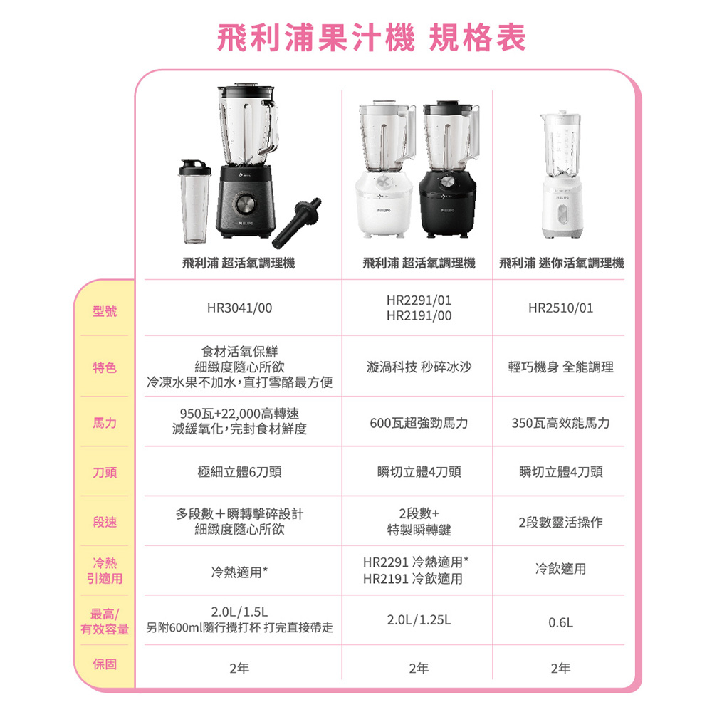 商品規格品牌 PHILIPS 飛利浦類型 傳統果汁機型號 HR2510/01 產地 中國內部材質 塑膠電壓 110V商品尺寸(材積) 14.5*25*25cm產品重量 1.05 kg容量(公升) 1~2L回轉數(RPM) 20000~25000轉保固 2年消耗功率 300~400WBSMI許可字號 R3D904