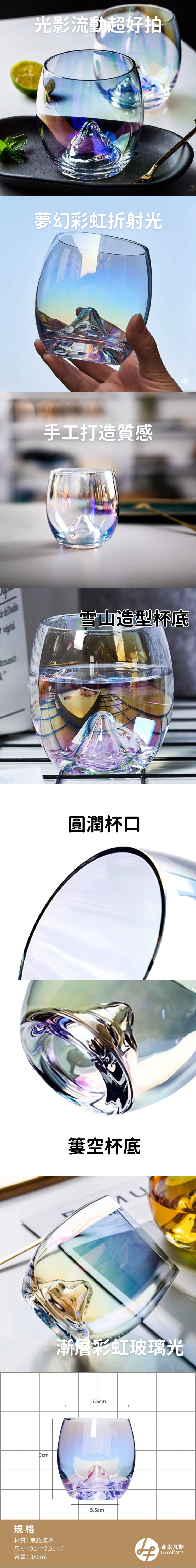 |商品規格|品名:彩虹雪山玻璃杯/威士忌杯容量:300ml(手工測量略有誤差)尺寸:約 高 9.5 cm × 杯口直徑 7.8 cm材質:高硼矽玻璃顏色:彩虹折射款特色:耐高低溫/立體山形底座/可用於威士忌、果汁、冰飲📍 杯底為手工製作,每個紋理略有差異屬正常現象