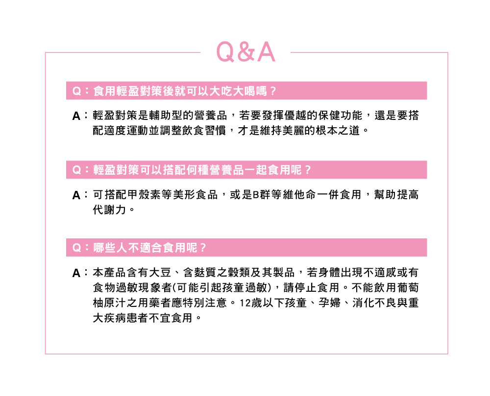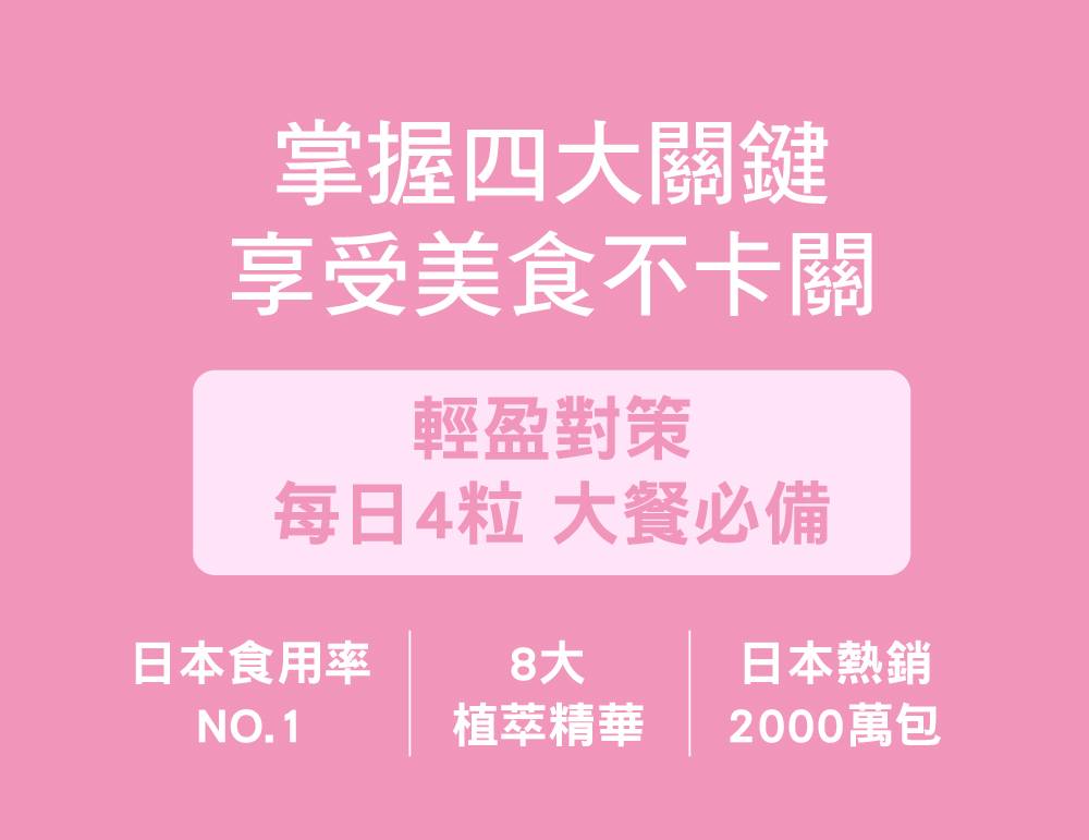 • 日本食用率第一,熱銷超過 4,400萬包的燃燒系保健品• 核心爆燃成分「毛喉鞘蕊花(Forskohlii)」,分解囤積、提升代謝及維持LBM• 添加纖維素、洋菜,促進消化、順暢排空,輕盈不卡卡• 維生素B1、B2、B6三重代謝助攻,補充活力、調整體質• 每日2~4粒,啟動爆燃燒卡力,窈窕管理無負擔