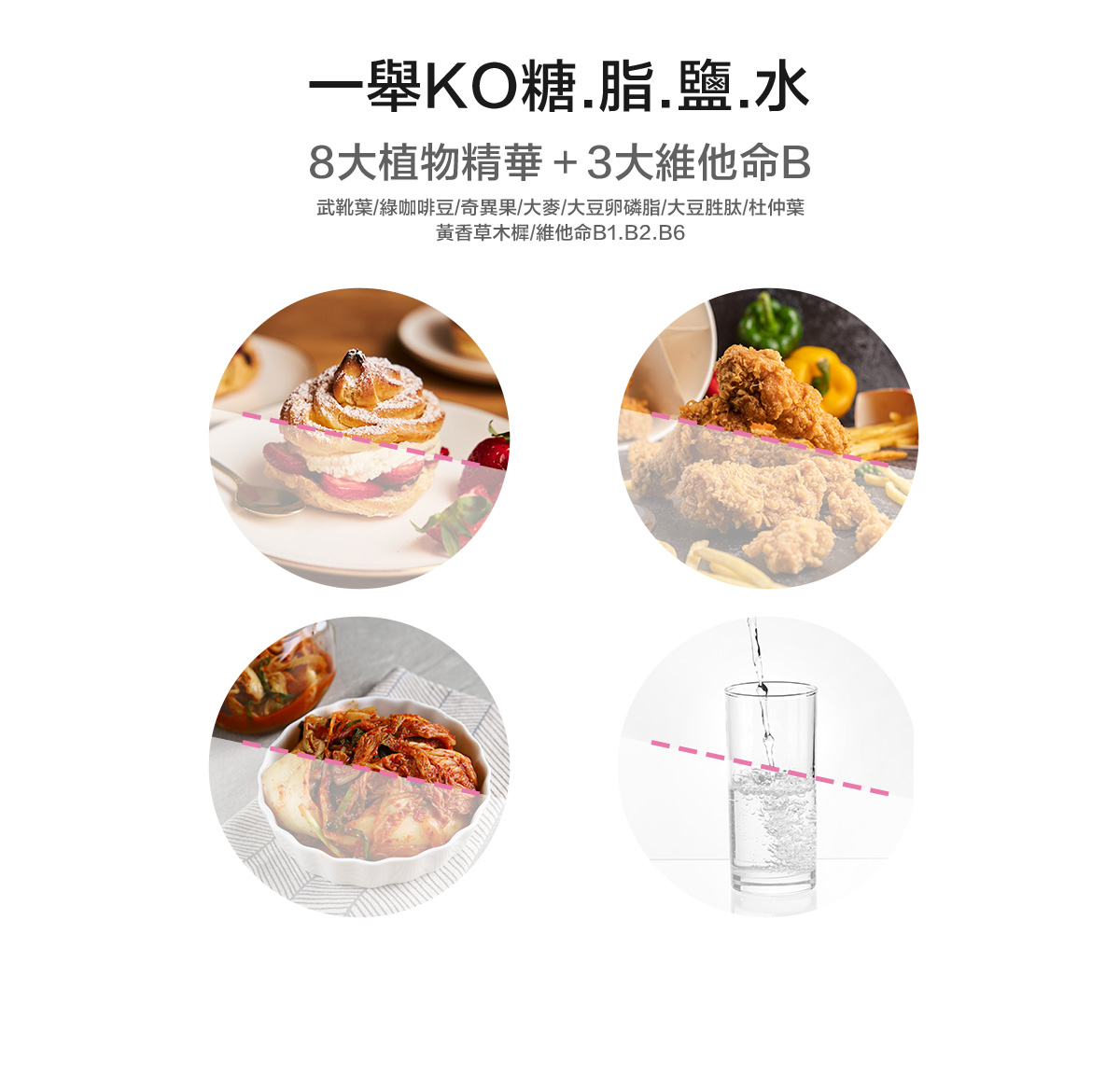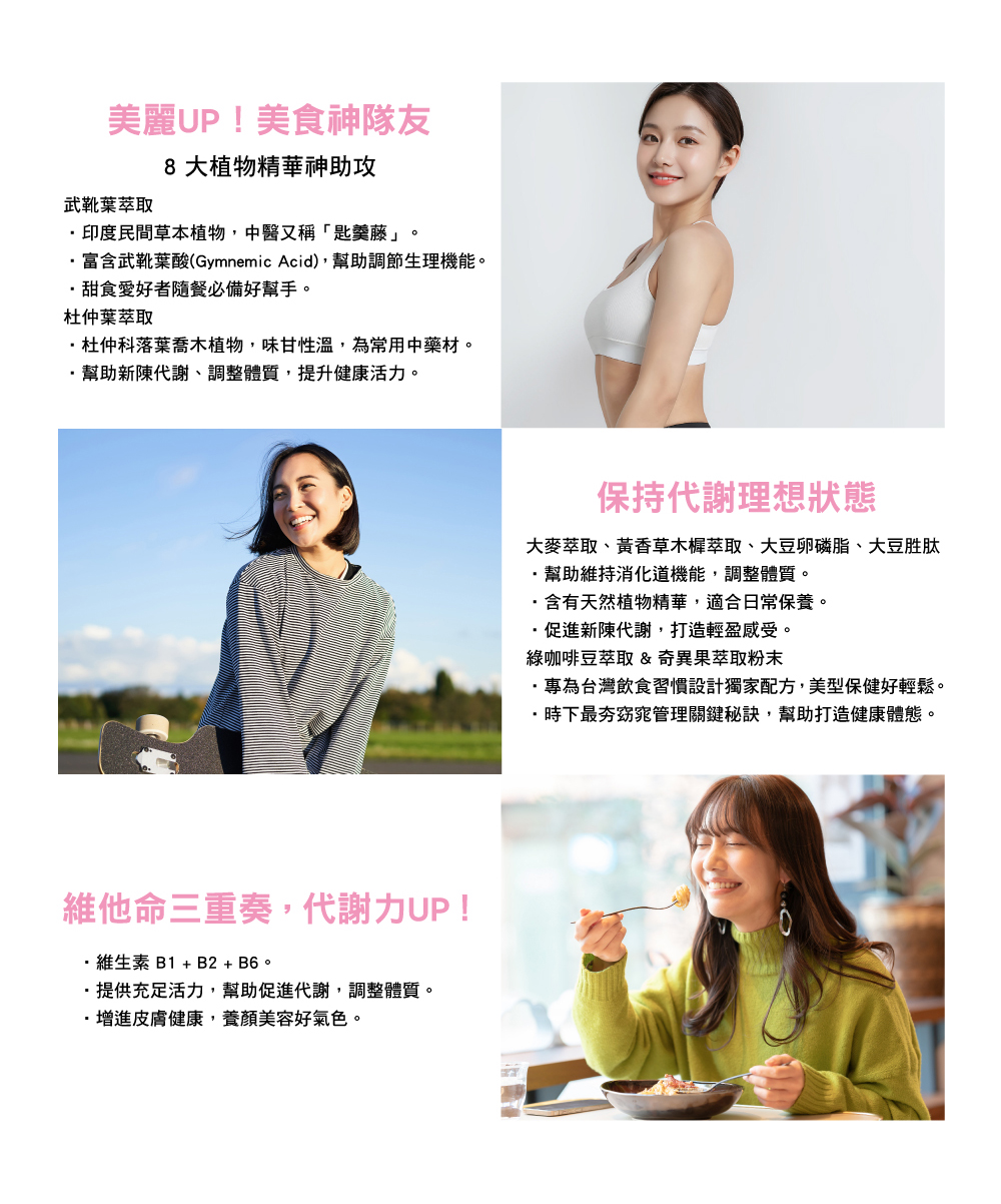 • 武靴葉、杜仲葉、綠咖啡豆等8大植物精華,全方位窈窕秘訣。• 維他命B1+B2+B6促進活力代謝三重奏,健康管理更全面。• 日本熱銷2,000萬包,輕鬆享受美食大餐不NG。• 專為台灣飲食習慣設計獨家配方,美型保健好輕鬆。• 每天4粒,一包30天份。