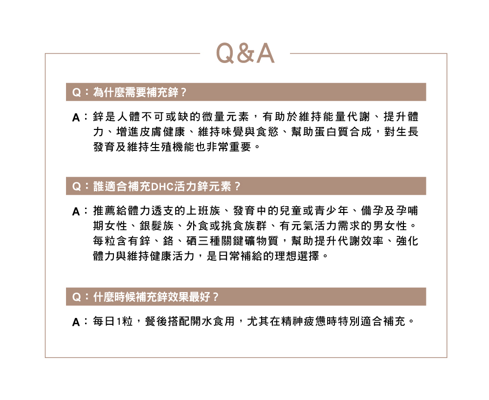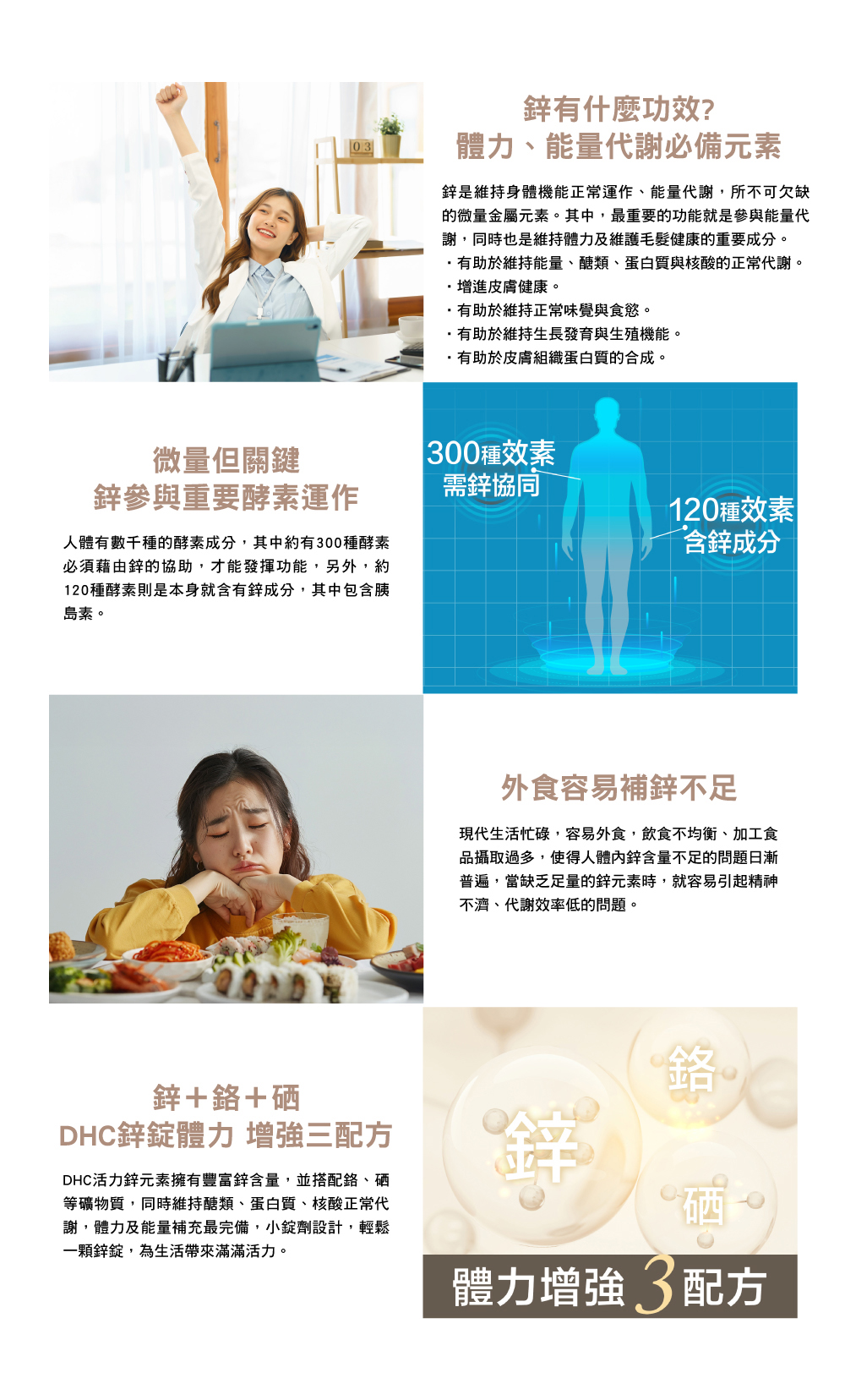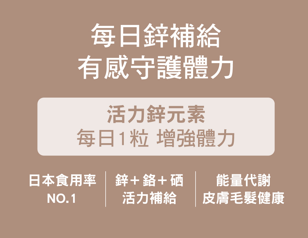 • 豐富鋅含量,一顆鋅錠讓你擁有整日滿滿活力,元氣不求人!• 鋅保健食品首選!推薦給外食族、體力及食慾不佳,想增強體力,重拾生活節奏的您。• 搭配鉻、硒等礦物質,維持醣類、蛋白質、核酸正常代謝,能量補充再升級!• 幫助調整體質,充實旺盛精神,提升男性魅力,增強日夜體力,也可幫助女性補充營養素。• 每日1粒,一包30天份。