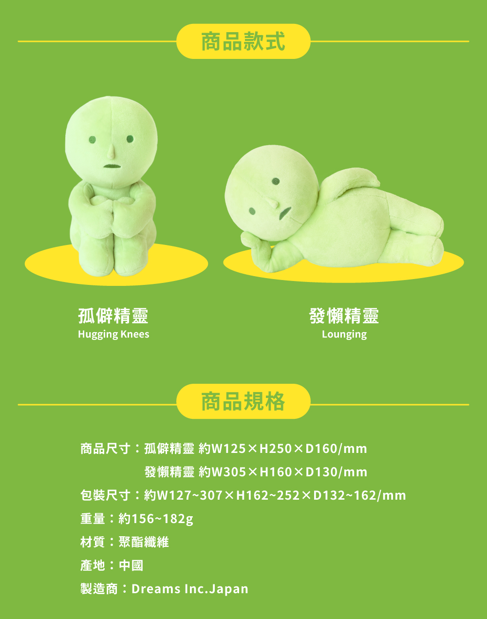 產品尺寸:孤僻精靈:約W125*H215*D160/mm 發懶精靈:約W300*H150*D110/mm包裝尺寸:約W127~307*H162~252*D132~162/mm重量:約156~182g產品材質:聚酯纖維產地:中國製造商:Dreams Inc. Japan
