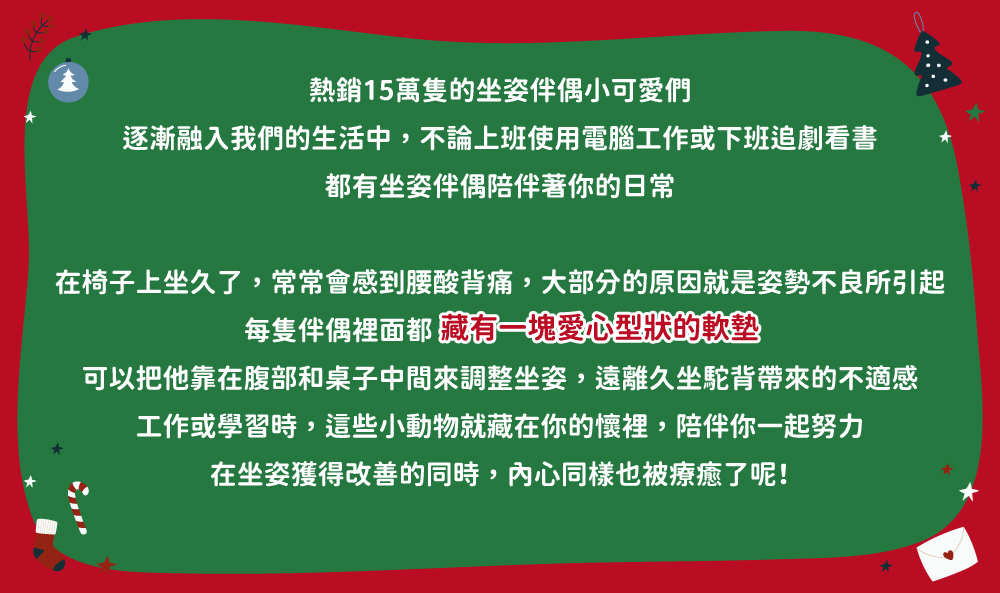 近年席捲全球,熱銷15萬隻的坐姿伴偶不論是上班使用電腦工作,或是下班追劇看書時時刻刻都陪伴者你,逐漸融入我們的生活。「他們有一顆「心」,治癒你的不良姿勢」