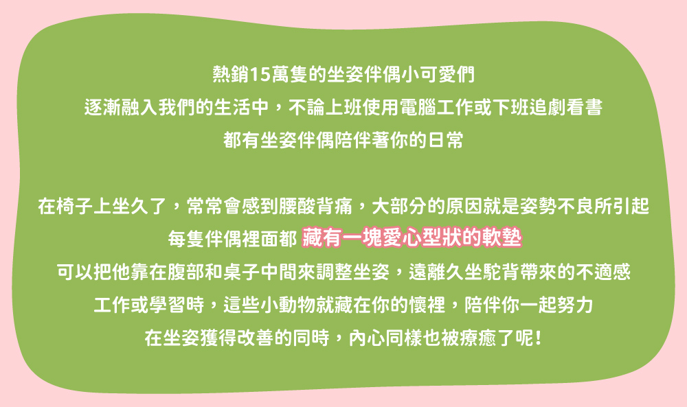近年席捲全球,熱銷15萬隻的坐姿伴偶不論是上班使用電腦工作,或是下班追劇看書時時刻刻都陪伴者你,逐漸融入我們的生活。「他們有一顆「心」,治癒你的不良姿勢」