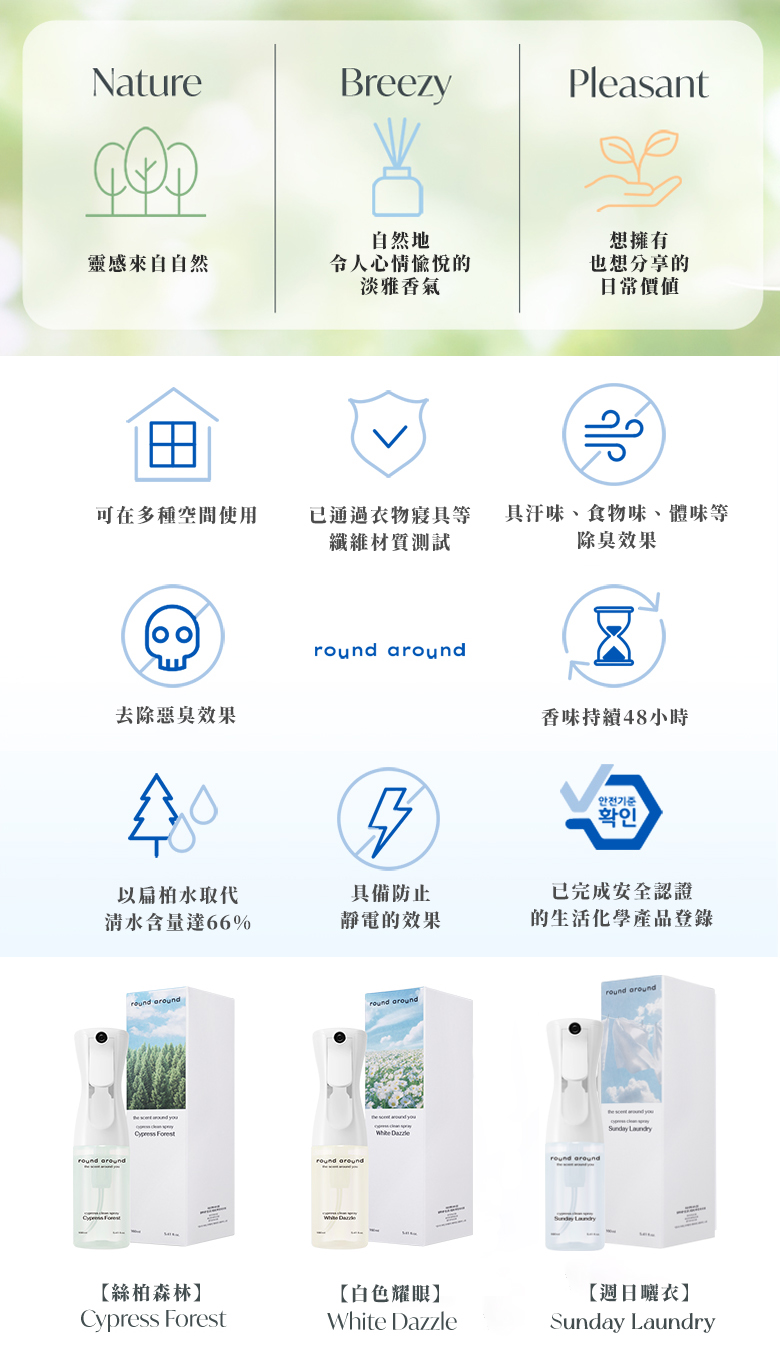 晚安你好乾淨的氣味,總能讓人安心這款韓國 ROUND A’ROUND 柏樹除臭噴霧把森林的清香與陽光的柔光都裝進瓶裡含有 66% 扁柏水能有效去除異味、防止靜電適合噴在衣物、床單、枕頭、車內與空間中香氣是那種清透的「剛洗完」感不是濃烈的香水味,而是乾淨空氣的味道