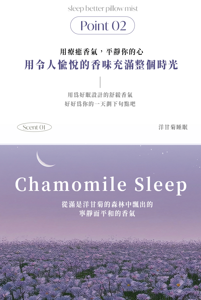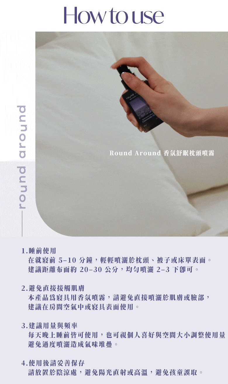 • 請使用於寢具類商品(枕頭、枕頭套)或空氣中,請勿直接噴灑於皮膚、臉部