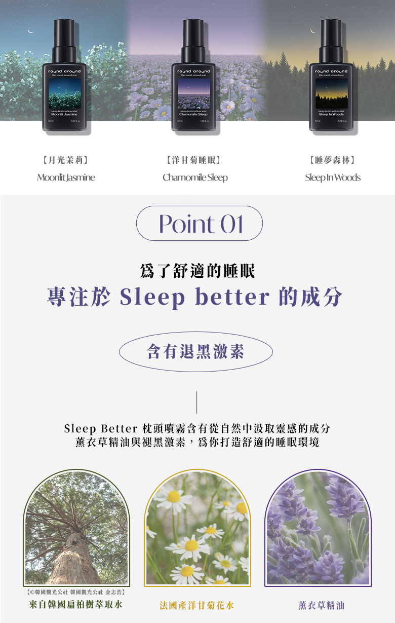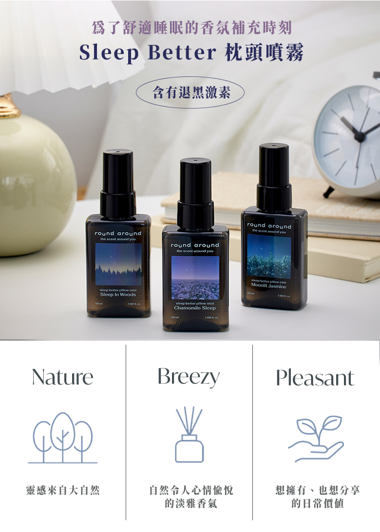晚安你好有時候,放鬆需要一點香氣的引導ROUND A’ROUND 的 Sleep Better 枕頭噴霧專為睡前打造的柔和氣味讓夜晚變得更平靜、更安心含有退黑激素與天然植物萃取在香氣的陪伴中放慢思緒輕輕噴在枕頭、床單或空氣中讓房間充滿療癒的氣息一瓶香氣,讓入睡成為生活裡的小儀式