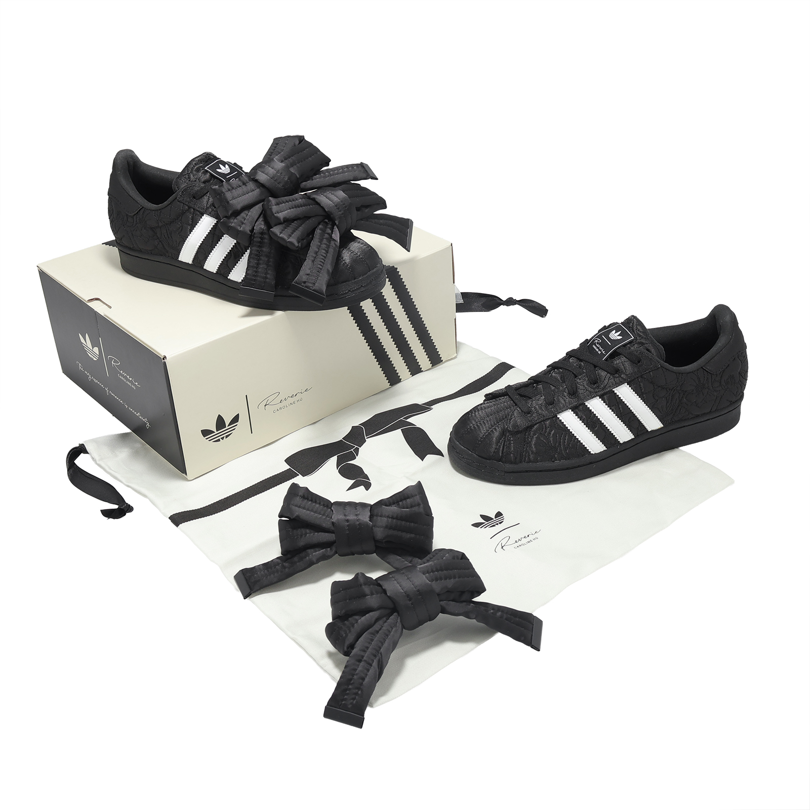 * 以經典的 Superstar 鞋款為設計基礎,搭配誇張蝴蝶結設計,搭配緞面材質,打造高質感與及高辨識度。