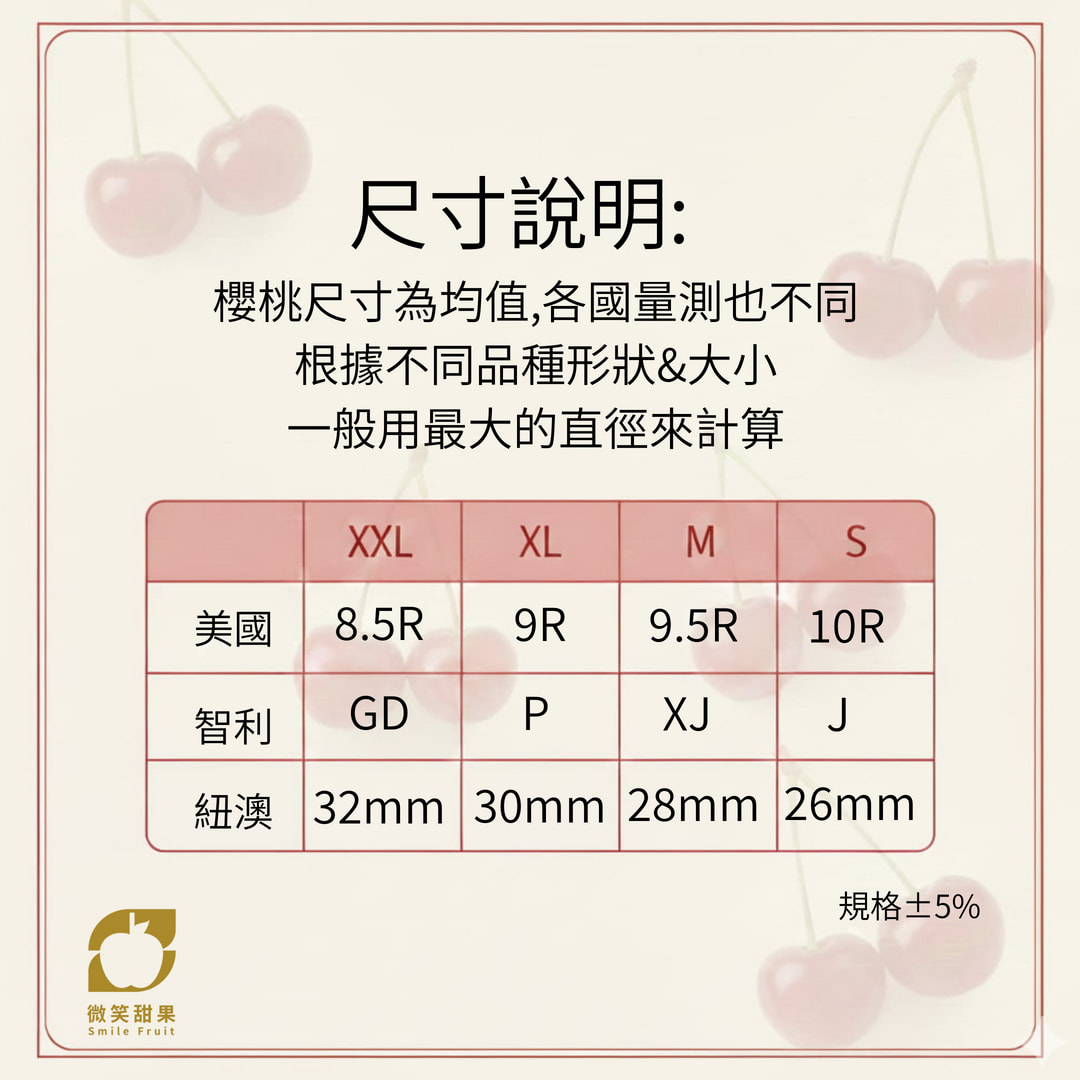 ⚠️ 注意事項:• 櫻桃屬於較嬌嫩果物,運送過程可能出現輕微碰傷或壓痕,屬正常範圍,不影響食用。• 水果為天然農產品,大小、色澤、甜度、軟硬度皆可能略有差異。• 出貨前皆由人工檢視果況,但仍可能有 2–3 顆輕微外觀瑕疵果,屬合理範圍。• 收到商品請務必立即錄影開箱;如有缺件或嚴重瑕疵,請於 24 小時內提供照片/影片與客服聯繫。• 生鮮商品不適用 7 天鑑賞期,恕不接受因個人口感或外觀差異退換貨。【天然產物無法完全控管,完美主義者請斟酌下單】