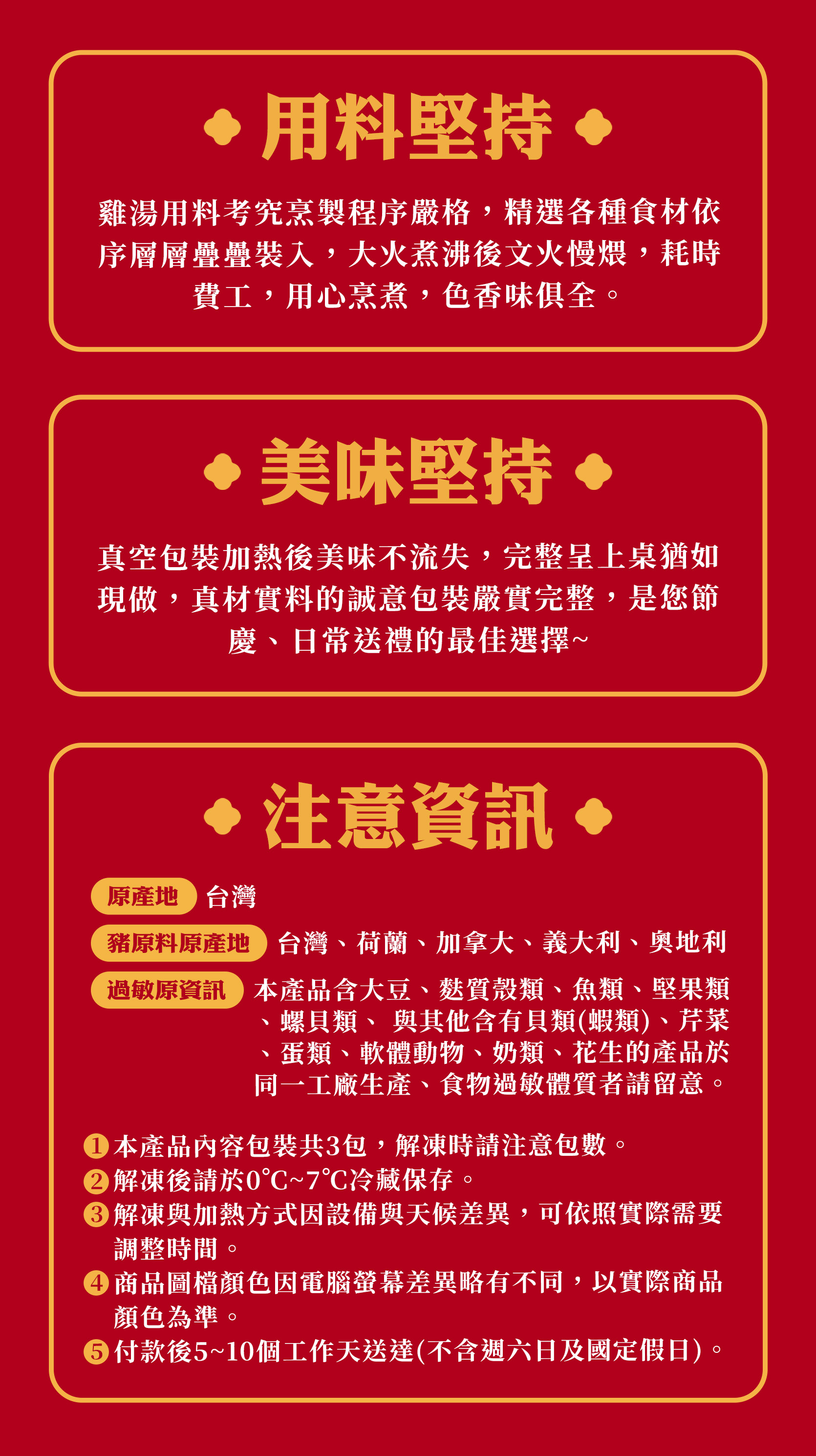 完成付款後3-7個工作天內送達(不含週六日及國定假日),若宅配公司遇上不可控制的交通因素可能會有提早或是延遲的狀況,若遇繁盛期(如農曆新年期間等)商品將可能延遲2~3日送達,不另行通知,期間商品將依冷凍全程完整保存,造成不便敬請見諒。