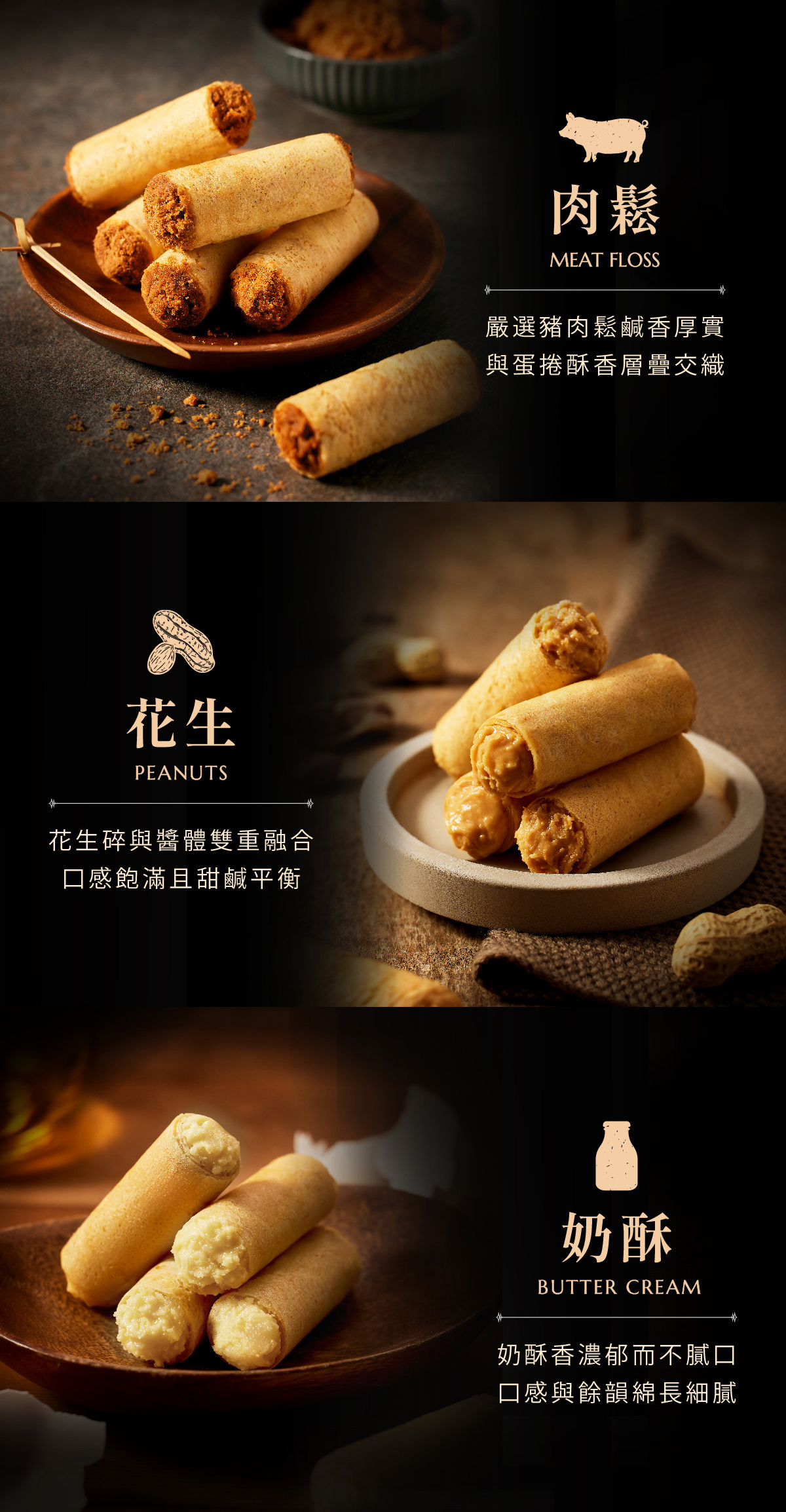 ・規格:滿餡蛋捲20入(肉鬆20入、花生20入、奶酥20入、肉鬆10入+花生10入、肉鬆10入+奶酥10入)