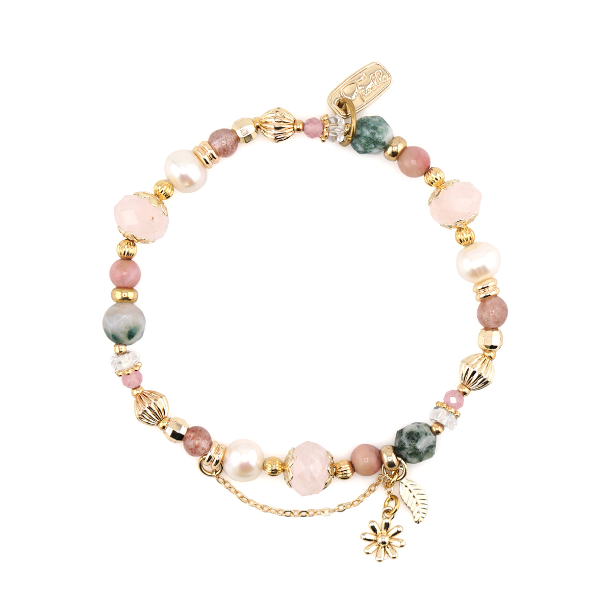 – 商品材質 Product Materials –粉晶、紅紋石、水草瑪瑙、白水晶、粉貓眼石、草莓晶、淡水珍珠、黃銅鍍18K金