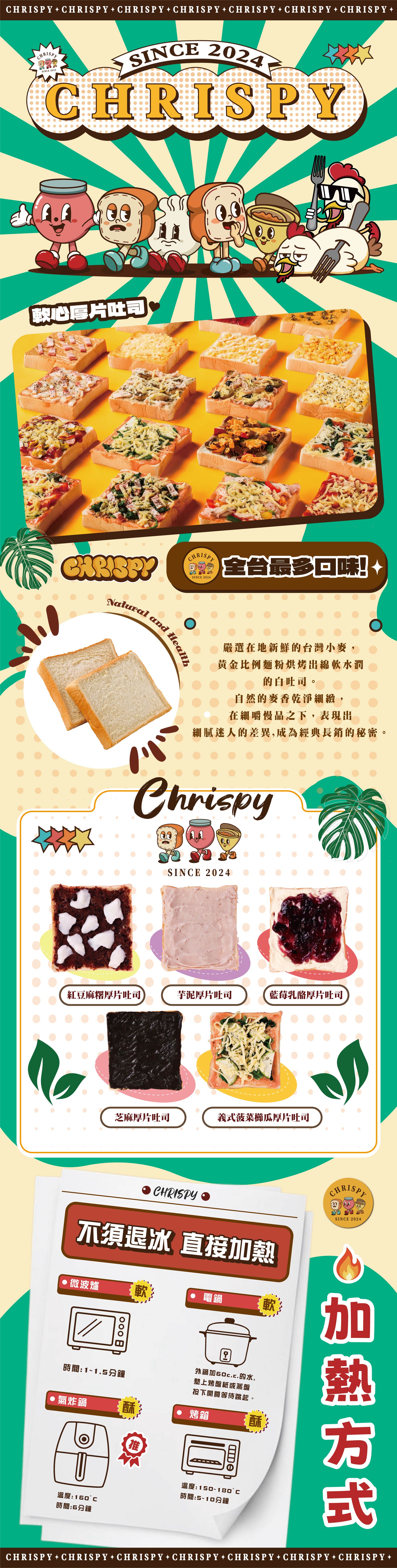 【✦ 純植幸福禮盒】(素食) 5入⏹ 商品內容義式菠菜櫛瓜厚片吐司1入芋泥厚片吐司1入紅豆麻糬厚片吐司1入藍莓乳酪厚片吐司1入芝麻厚片吐司1入