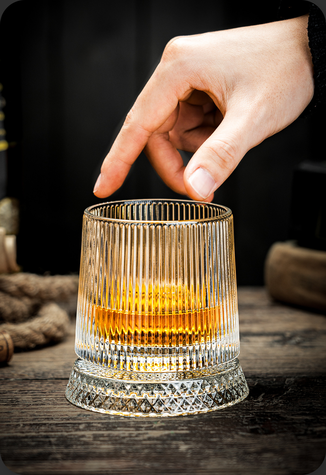 以細膩浮雕紋路打造的水晶威士忌杯,杯底特別設計旋轉結構,輕觸桌面即可優雅轉動,展現如陀螺般的律動光影。酒液在杯壁折射出迷人的琥珀色光芒,搭配精工浮雕的觸感,讓每一次品飲都成為視覺與感官的風格儀式。