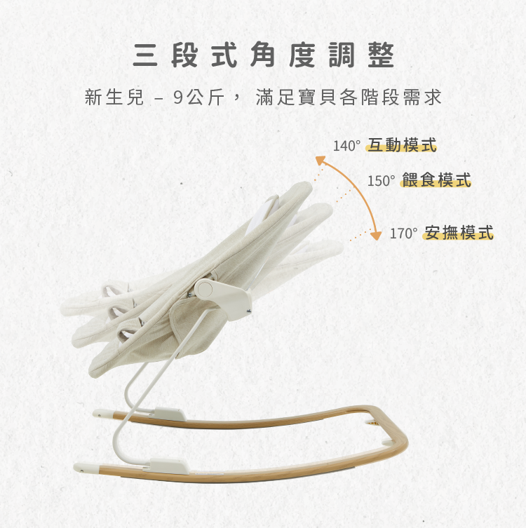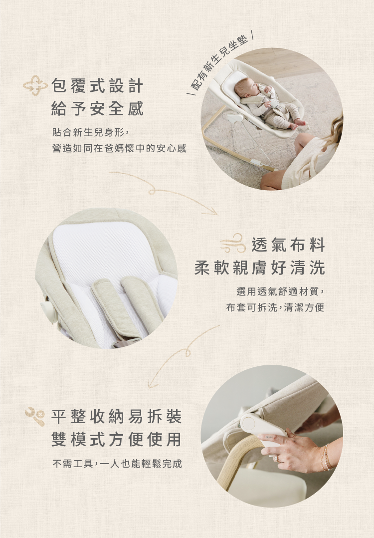 自然搖擺安撫寶寶情緒,也可切換為固定模式,穩穩支撐餵奶或小睡時刻