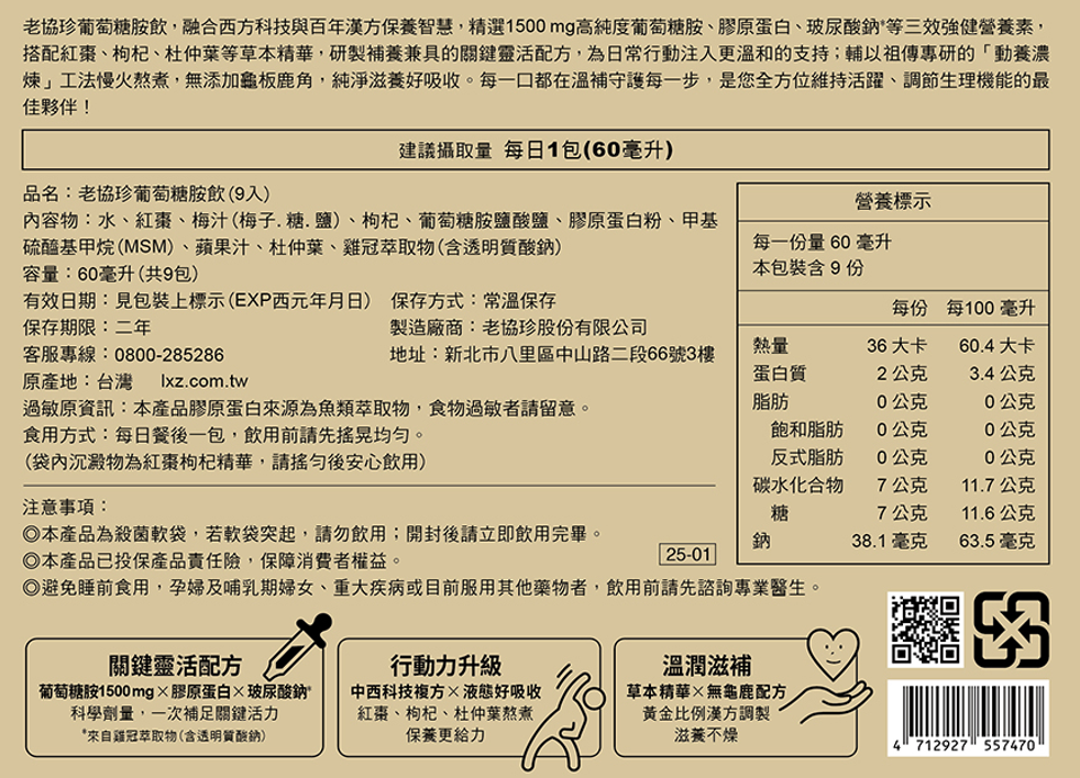 成份 :水、紅棗、梅汁(梅子.糖.鹽)、枸杞、葡萄糖胺鹽酸鹽、膠原蛋白粉、甲基硫醯基甲烷(MSM)、蘋果汁、杜仲葉、雞冠萃取物(含透明質酸鈉)