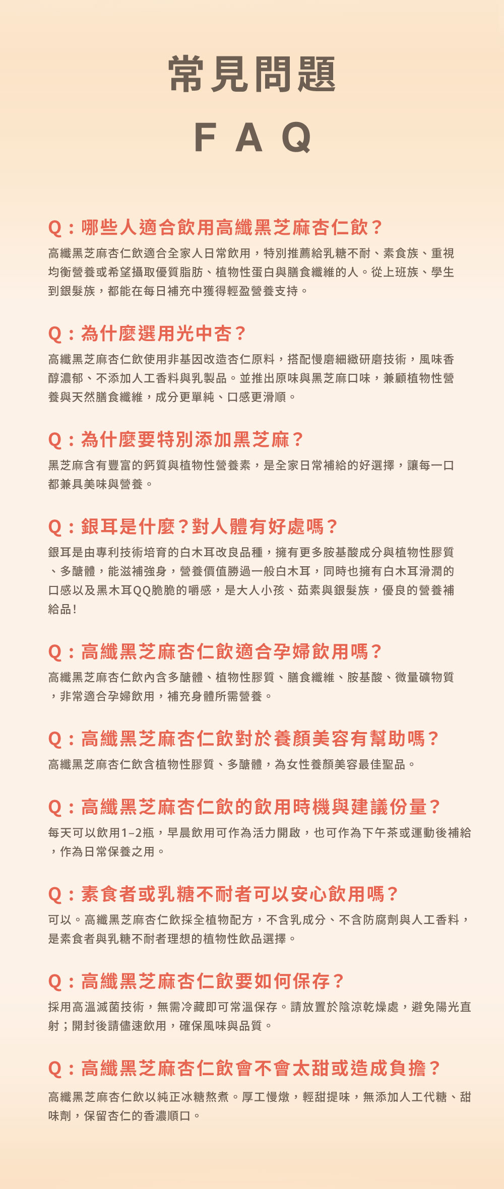 成分:水、杏仁粉、玉米來源可溶性纖維、冰糖、白木耳、黑芝麻粉、糙米粉