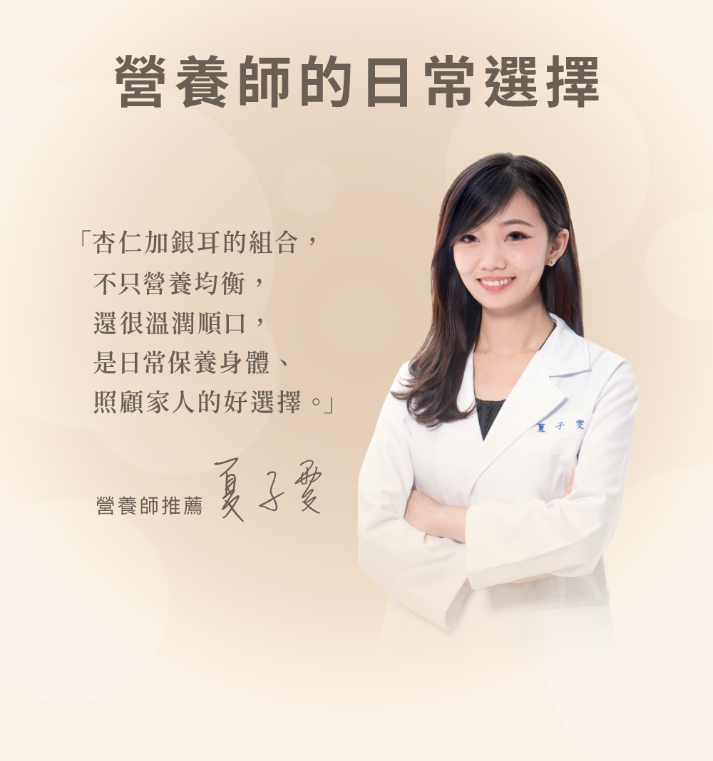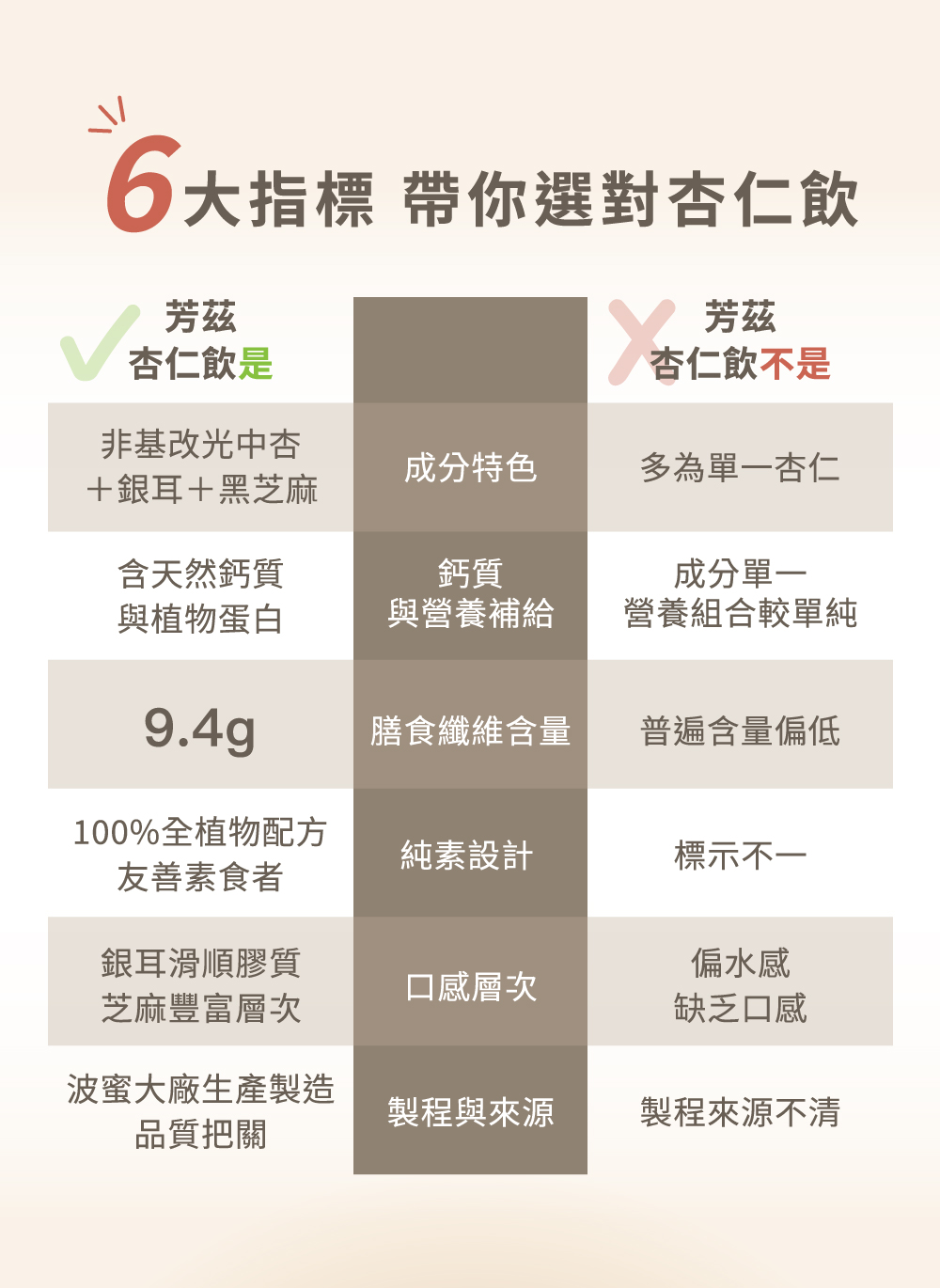 .嚴選光中杏、台灣有機雪耳,香濃純粹口感滑順.全素配方,植物性蛋白與膳食纖維增添飽足.精選黑芝麻含鈣質,維持穩健行動力.無乳糖,無膽固醇,輕鬆無負擔
