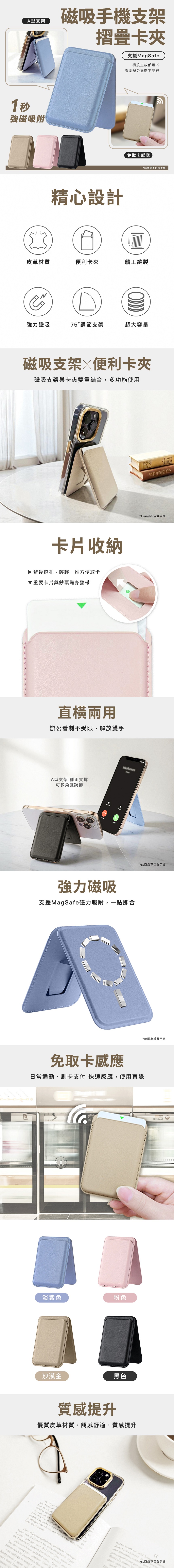 ■ 磁吸支架與卡夾雙重結合,多功能使用■ 支援MagSafe磁力吸附,一貼即合■ 卡夾設計,重要卡片與鈔票隨身攜帶■ 直橫兩用,辦公看劇不受限,解放雙手■ A型支架設計,穩固支撐■ 優質皮革材質,觸感舒適,質感提升■ 免取卡感應,使用直覺,快速俐落