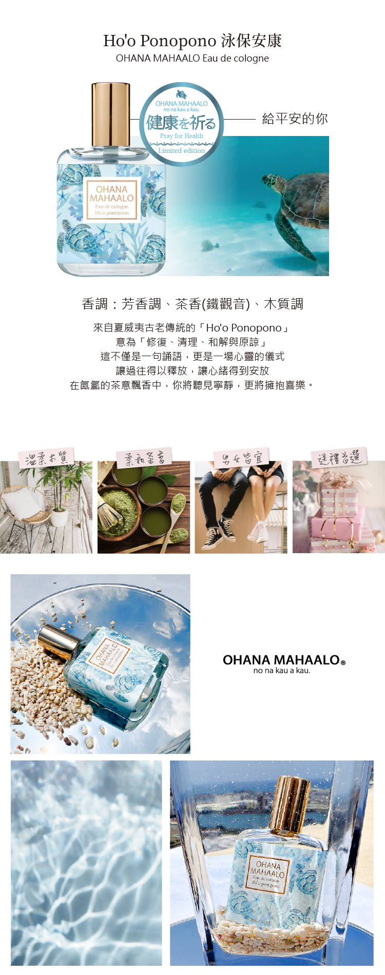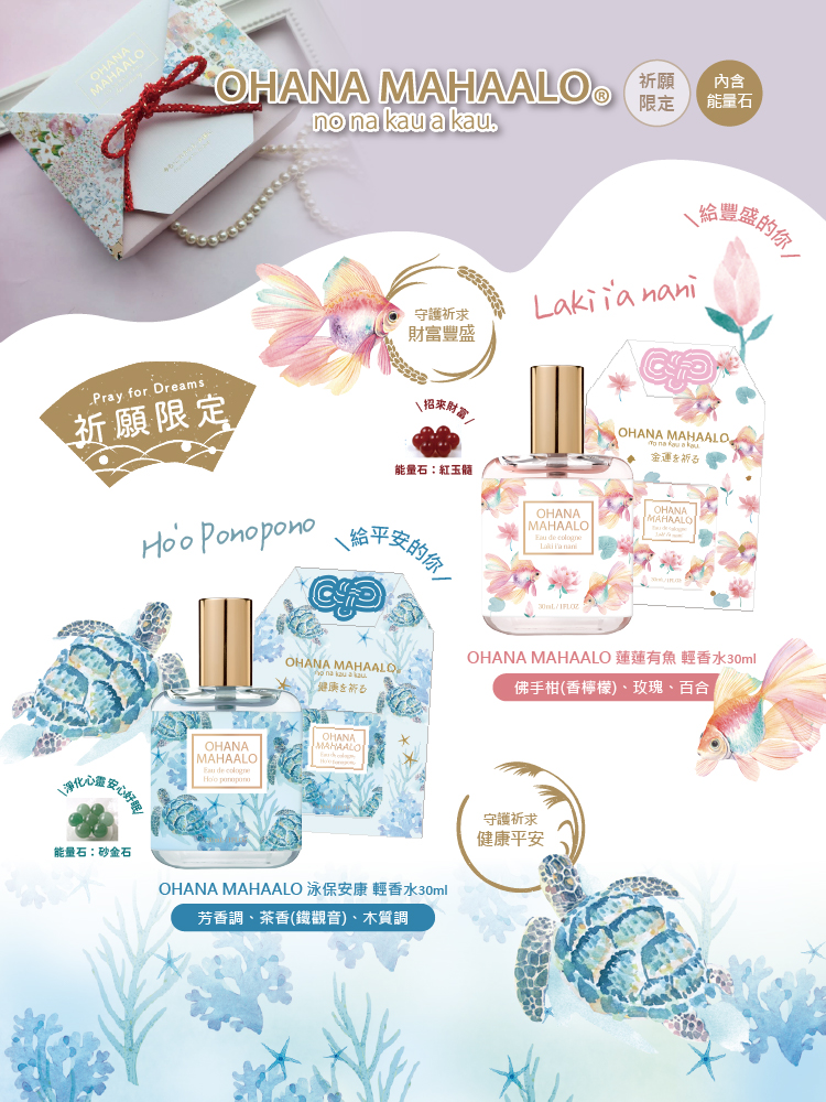 ◆商品內容 【要健健康康的喔!!】OHANA MAHAALO 泳保安康 香香對對包福盒 (輕香水+香水吊飾)OHANA MAHAALO 泳保安康 輕香水30ml (祈願限定) x1OHANA MAHAALO 泳保安康 十時香隨限定香水吊飾 x1◆香調 :芳香調、茶香(鐵觀音)、木質調◆材質: