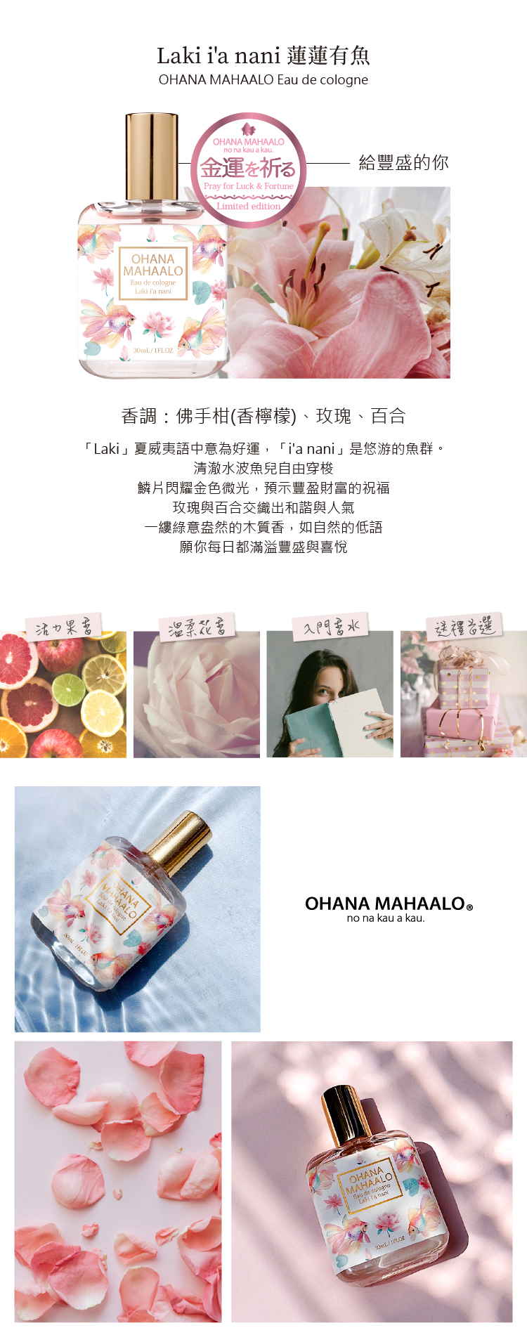 ◆商品內容 【金運上升】OHANA MAHAALO 蓮蓮有魚 香香對對包福盒 (輕香水+香水吊飾) OHANA MAHAALO 蓮蓮有魚 輕香水30ml (祈願限定) x1OHANA MAHAALO 蓮蓮有魚 十時香隨限定香水吊飾 x1◆香調 :佛手柑(香檸檬)、玫瑰、百合◆材質:
