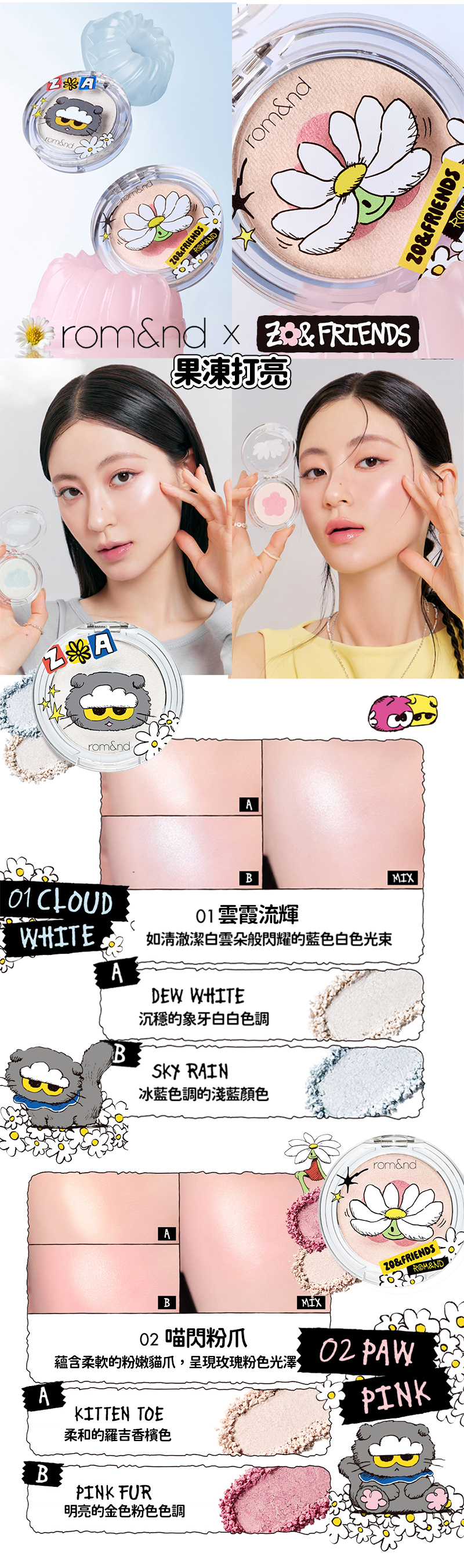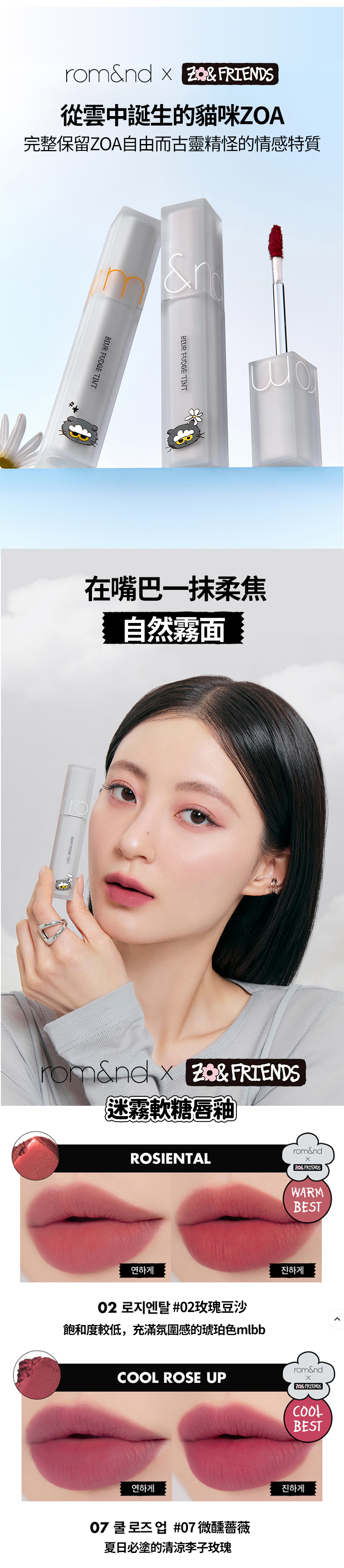 Rom&nd 與人氣角色 ZO&FRIENDS 首度攜手推出限定彩妝系列,以主角 ZOA 與多款可愛角色為設計靈感,打造兼具潮流感與收藏價值的聯名包裝。全系列涵蓋唇釉、唇膏、腮紅、高光、眼影與氣墊等多項人氣品項,延續 Rom&nd 一貫的高質感質地,並加入聯名限定圖樣與色彩概念,呈現可愛又時尚的妝容風格。