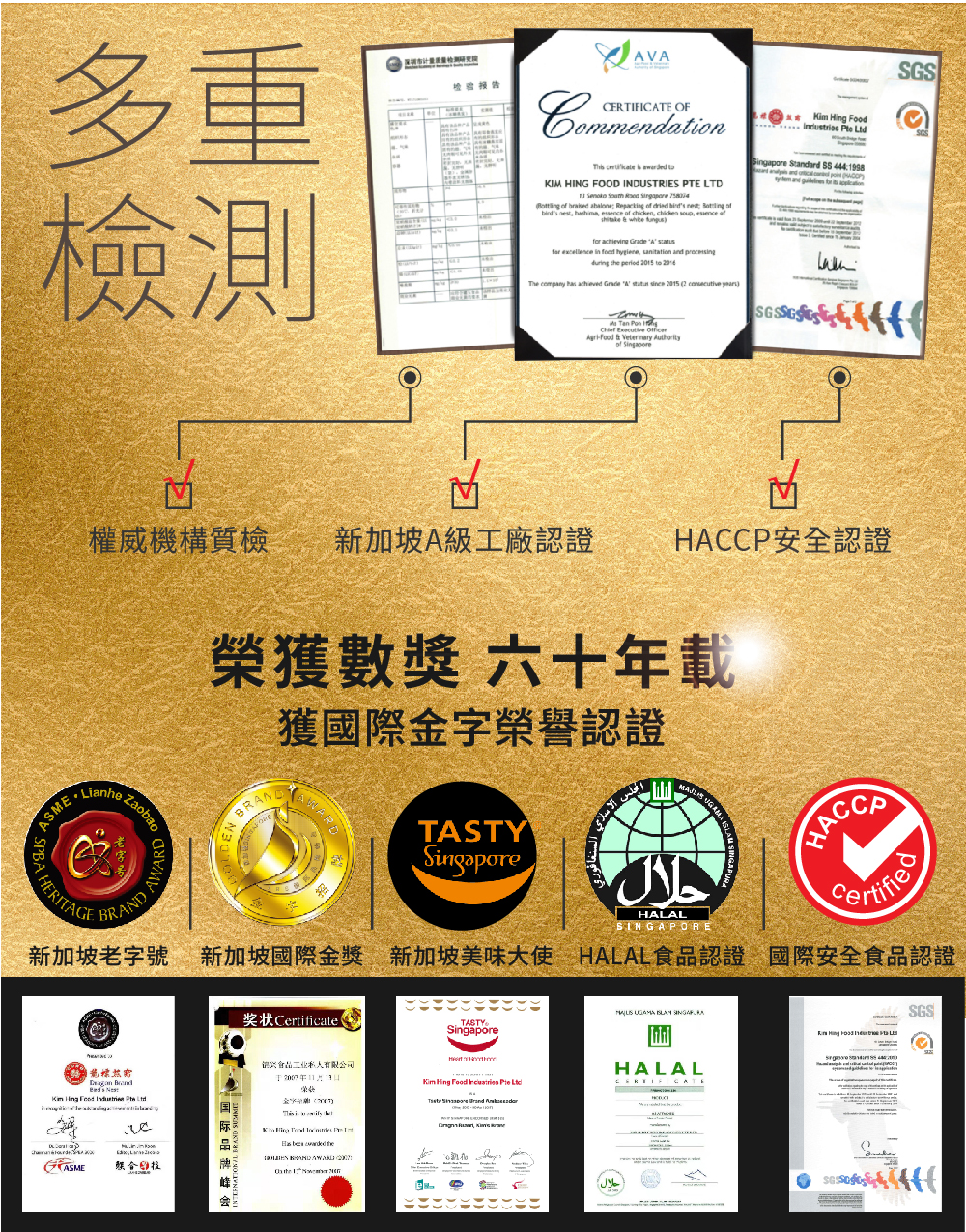 ‧濃縮燕窩,每瓶150ml,固形物含量97.8g,濃度高達65.2%‧保證100%百分百純燕窩,絕不作假!‧原瓶燉煮,保留完整營養‧國際SGS食品認證,安心使用 龍標燕窩獲新加坡60年在地「老字號」榮譽,以及國際品牌峰會的「金字招牌」之榮耀。