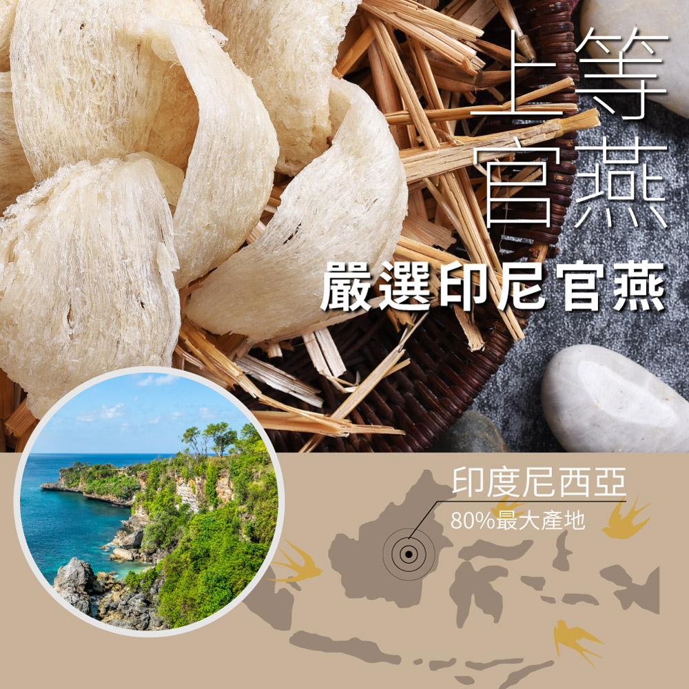 嚴選來自印尼的上等白官燕燕窩,純淨滑嫩,豐富營養,添加冰糖,微甜不膩風味更佳!