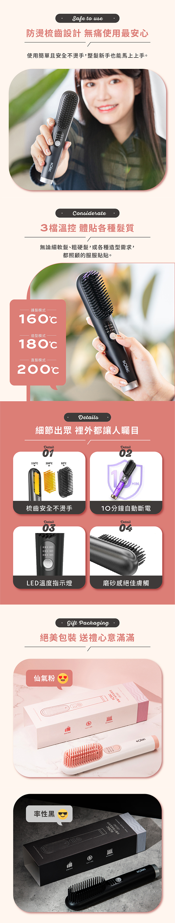 ▎sOlac直髮梳推薦,外出依舊保持美型▎六大亮眼特色,一手掌握造型▎175g造型梳超輕巧,保持漂亮零負擔▎無線束縛,50分鐘超長續航▎美髮梳千萬級負離子,中和靜撫平毛躁▎護髮蛋白塗層,造型不傷髮▎直髮梳30速熱,做造型無須久等▎梳子防燙梳齒設計,無痛簡單安全▎三檔溫控美髮梳,體貼各種髮質▎十分鐘自動斷電,LED溫度指示燈
