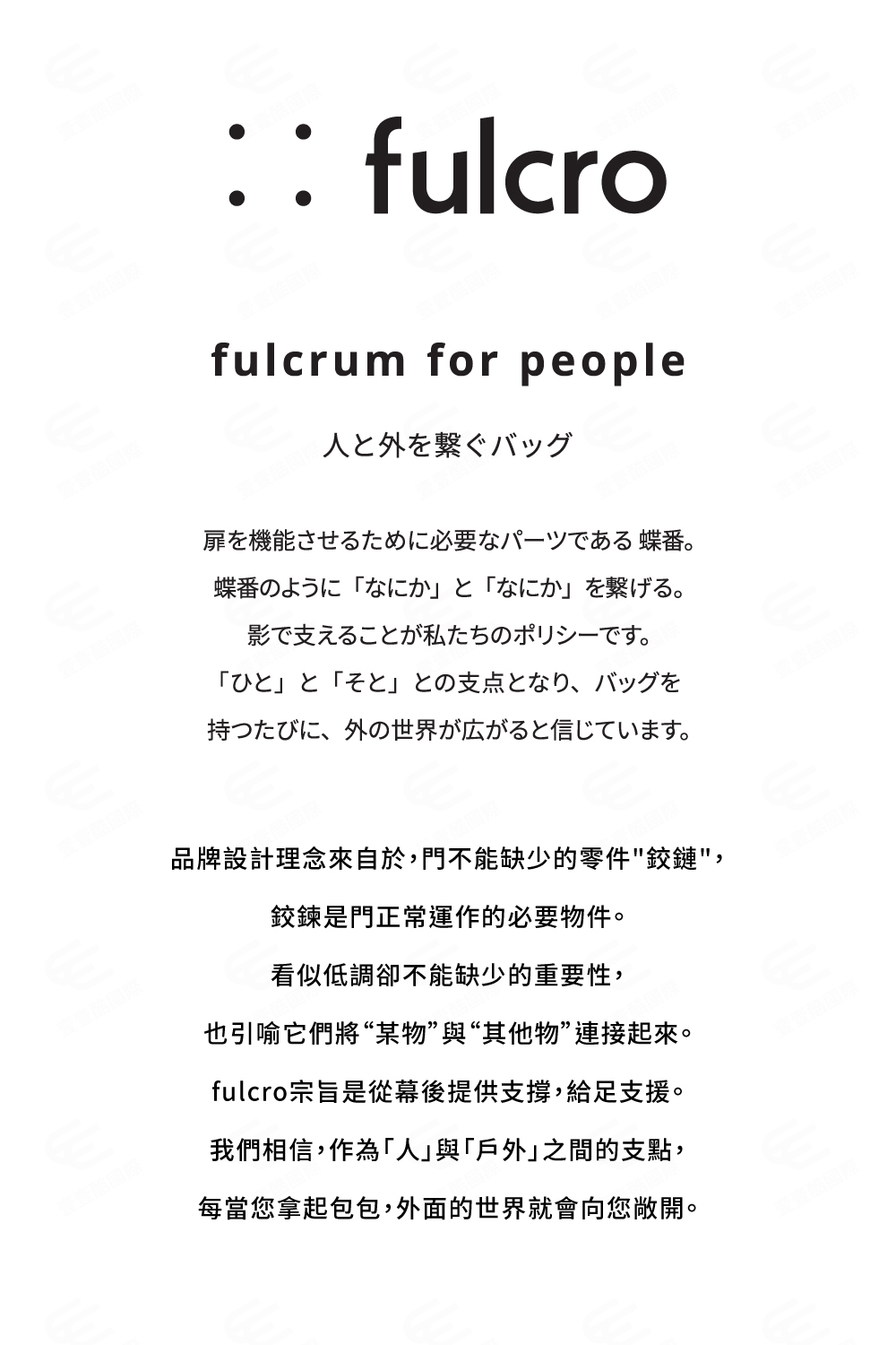 fulcro品牌設計理念來自於,門不能缺少的零件"鉸鏈",鉸鍊是門正常運作的必要物件。看似低調卻不能缺少的重要性,也引喻它們將“某物”與“其他物”連接起來。fulcro宗旨是從幕後提供支撐,給足支援。我們相信,作為「人」與「戶外」之間的支點,每當您拿起包包,外面的世界就會向您敞開。